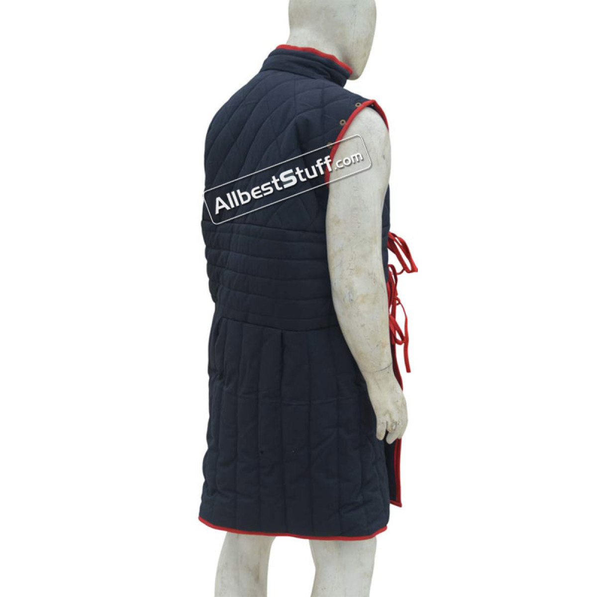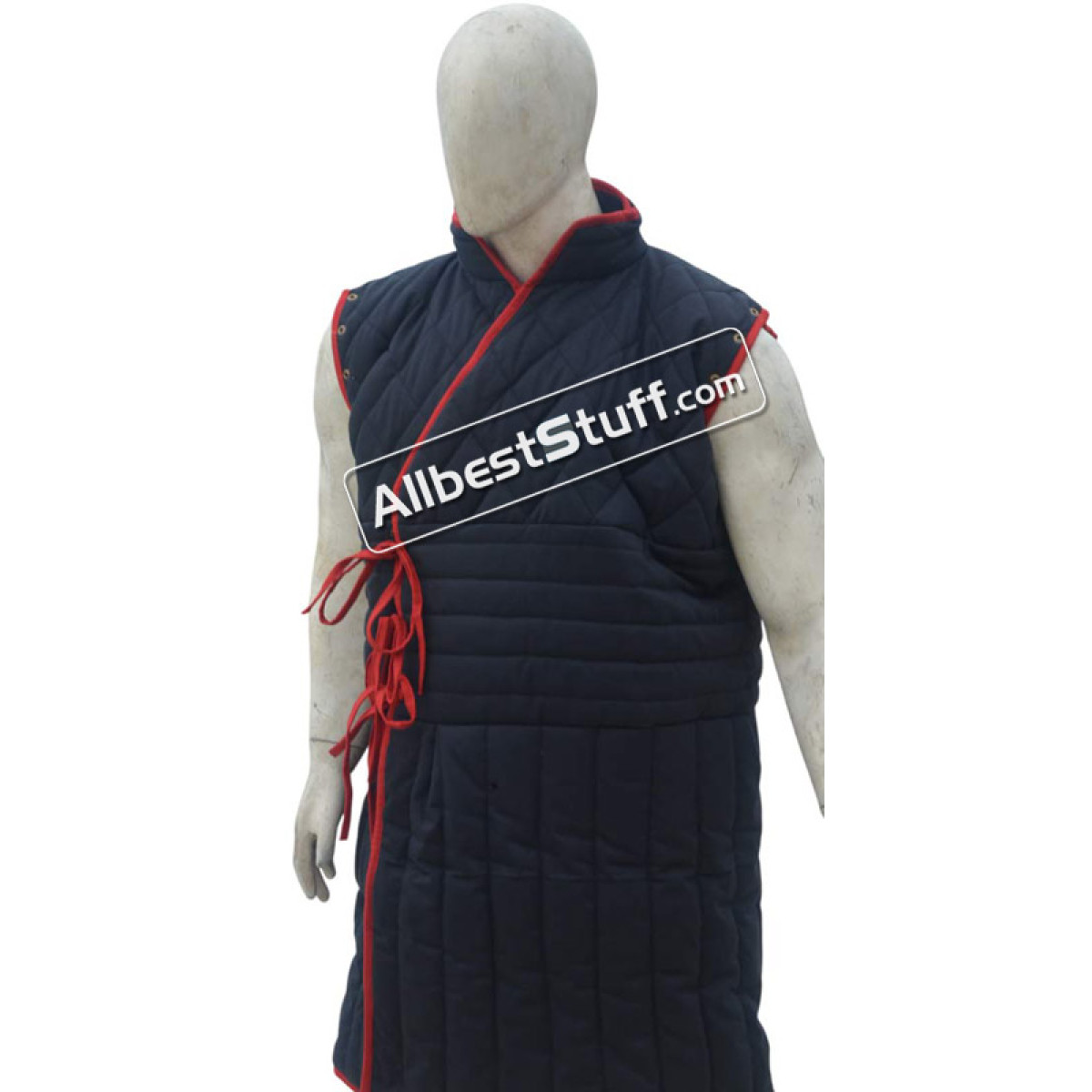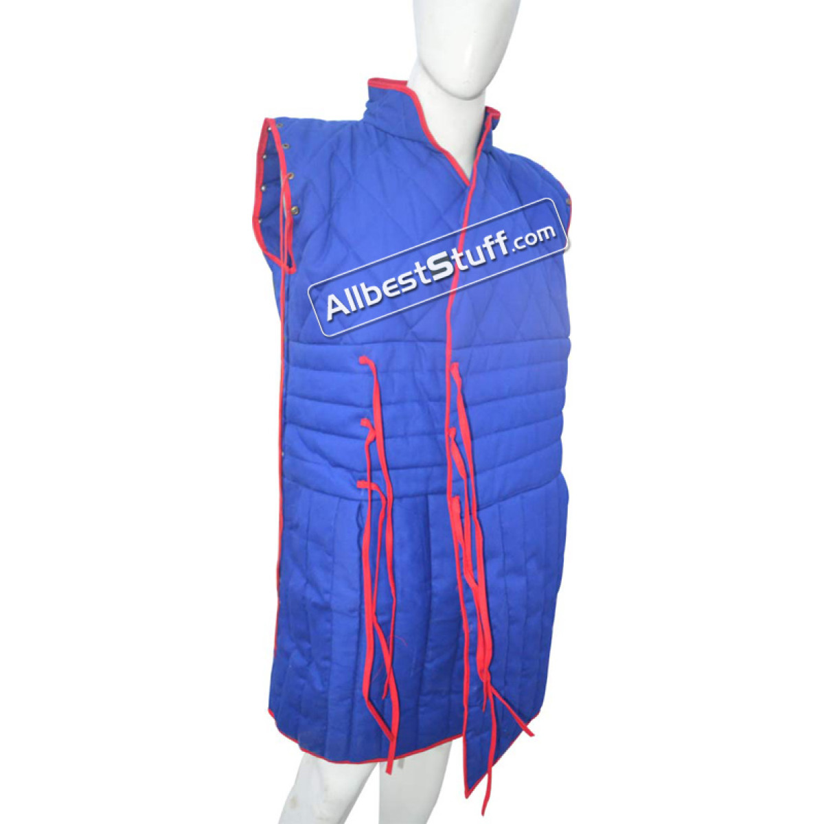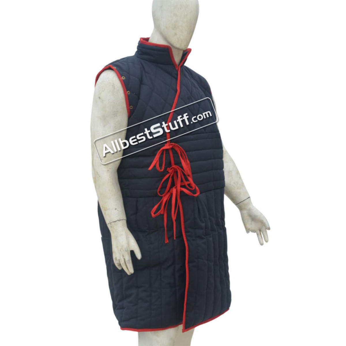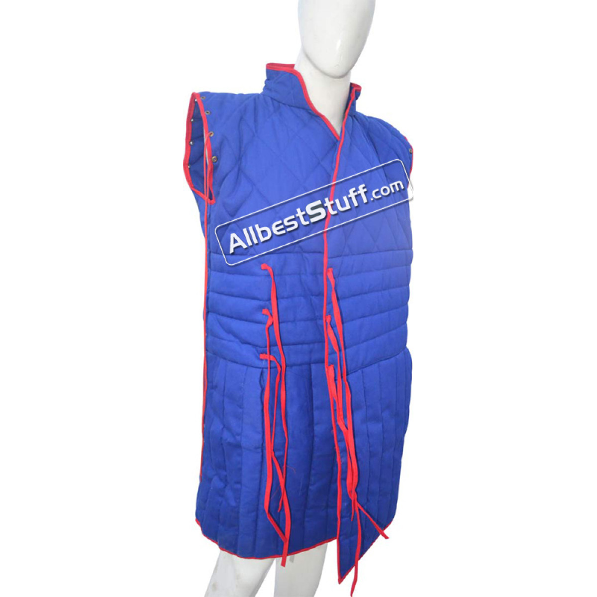 Sleeveless Padded Gambeson made from Quality Cotton. The padded gambeson can be worn under any kinds of armor. The tall collar increases comfort around the neck, as well. The Armor padding is stitched in a pattern that allows mobility and keeps the padding in place. Metal eyelets run along the edges of the arm holes and bottom helm of the sleeveless gambeson, allowing the addition or removal of sleeves as desired.