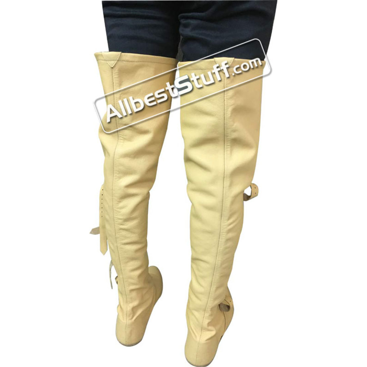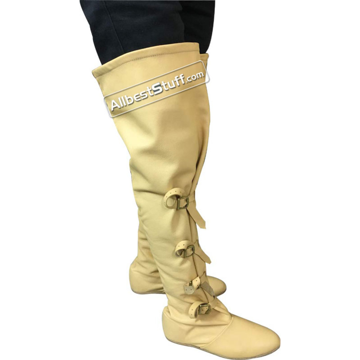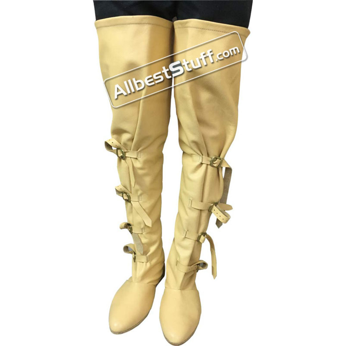Medieval Thigh length long soft leather boots with brass buckles and leather sole.