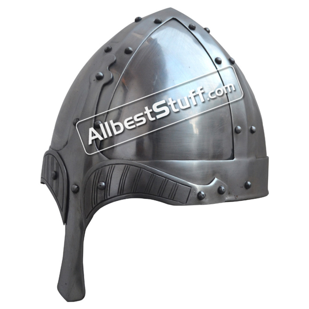 Fully reconstruction of a Viking Spangenhelm With Eyebrows and Nasal. this Spangenhelm With Eyebrows was very popular with the early medieval fighters of the north, Vikings, Varangians, the Rus and Normans. Manufactured from 14 gauge steel the four parts of the helmet are welded together and firmly riveted to the banding. the solid manufacture and the banding guarantee high robustness and therefore high protection. Use a heavy inner padding inside for protection. Standard Adult Size fully wearable.