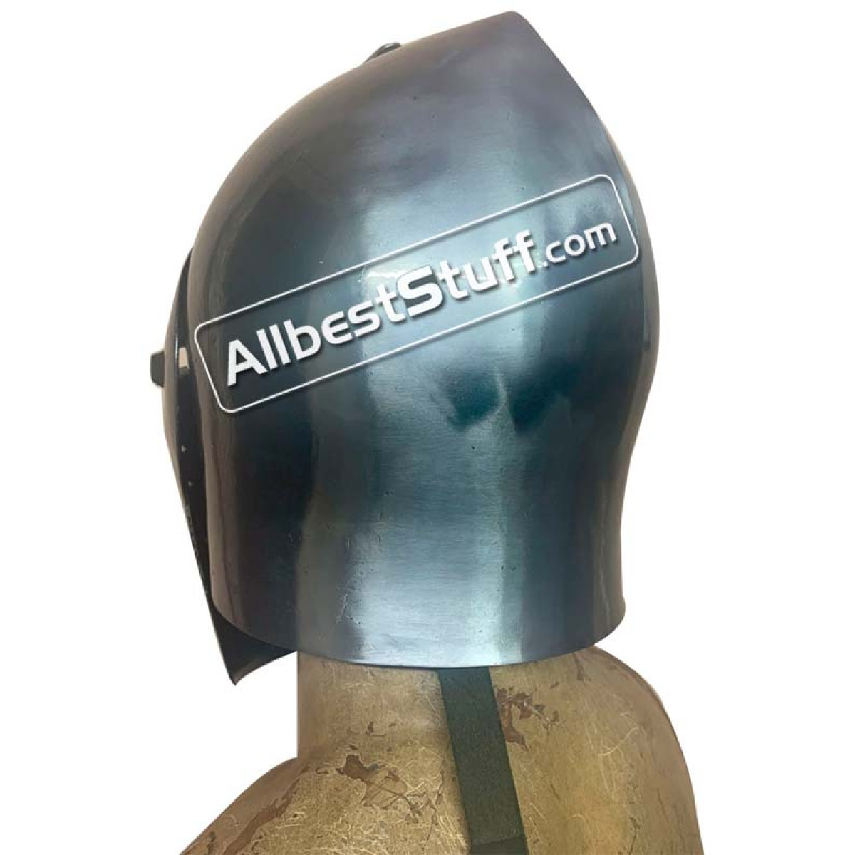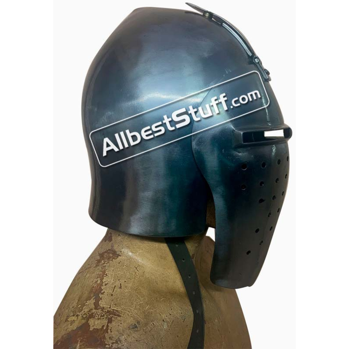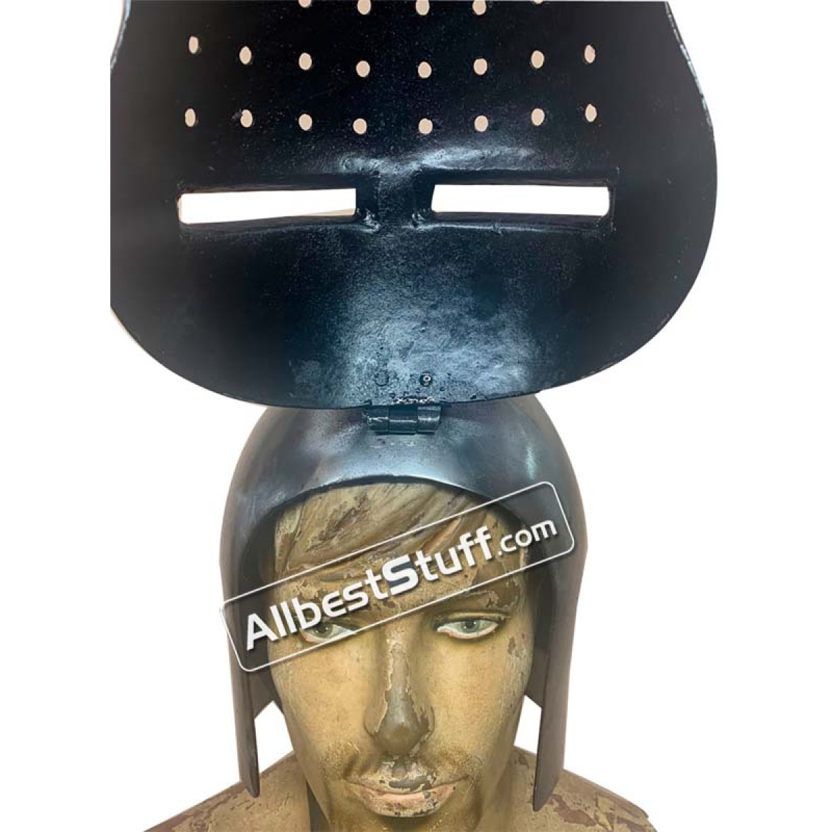 Fully battle ready reconstruction of a Medieval Visor Helmet. This version has a Medieval Visor Helmet which can be locked at the Head with a hook. Standard Adult Size fully wearable.