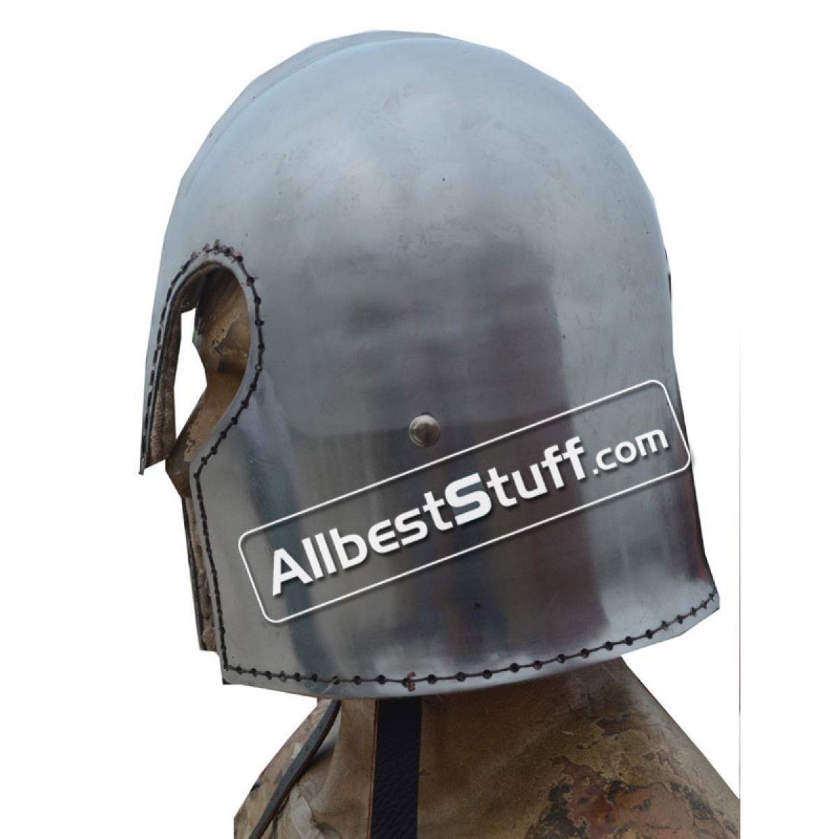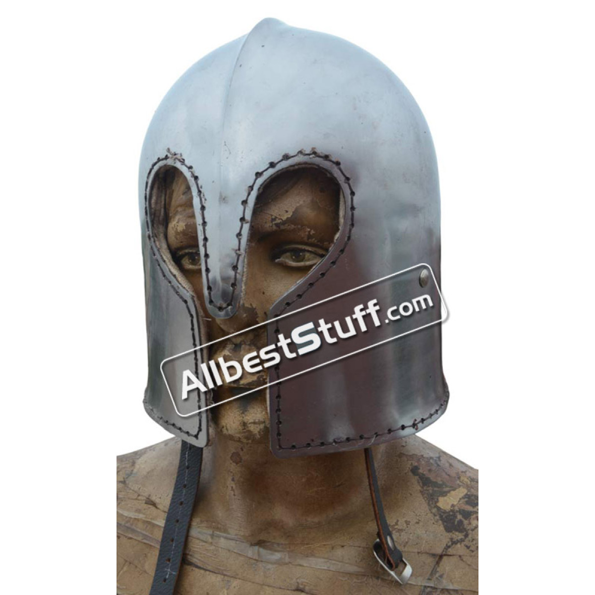 Medieval barbute is a visorless war helmet of 15th century Italian design, often with distinctive "T" shaped or "Y" shaped opening for the eyes and mouth. The barbute resembles classical Greek helmets and may have been influenced by a renewed interest in ancient artifacts. This is an egg-shaped eye-openings basic barbute. Hand-crafted from 14 Gauge mild steel.