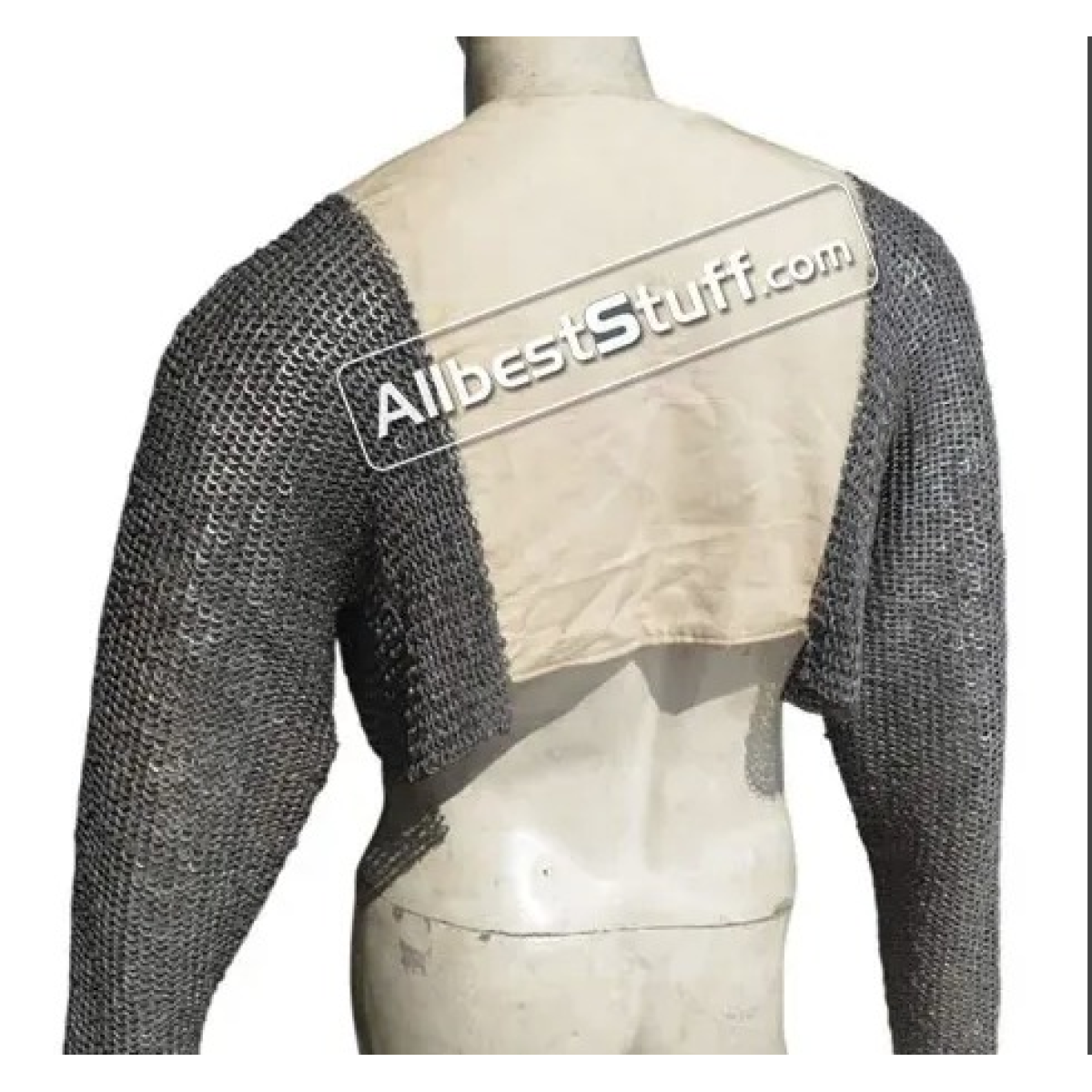 Specifications:Ring Type: 18 Gauge 6 MM Flat Dome Riveted Ring with alternating solid ringMaterial: Made from Mild Steel WireChest Size: 40 inches, comfortable fit for 35-36 inches with padding underneathBack is closed with the garment while front is open 7-8 inches, Choose Linen OR cotton fabric, comes with round eyelet with front laceSleeve Style: Fully ClosedLength of Sleeve: 20 inches measured from under the armpit area to wristSleeve Circumference at Armpit: 20 inches Overall Length from Shoulder: 17 inchesFinish: 02 Finish to choose fromNote: Double layered Garment stitched to chainmail, Outer fabric linen, inner fabric cotton