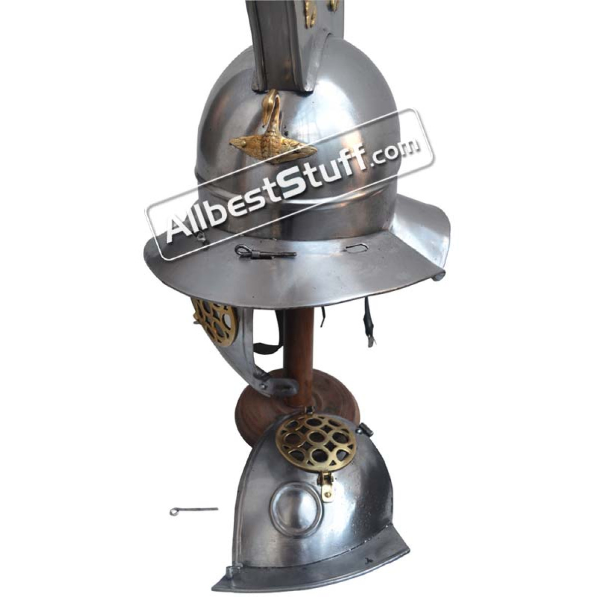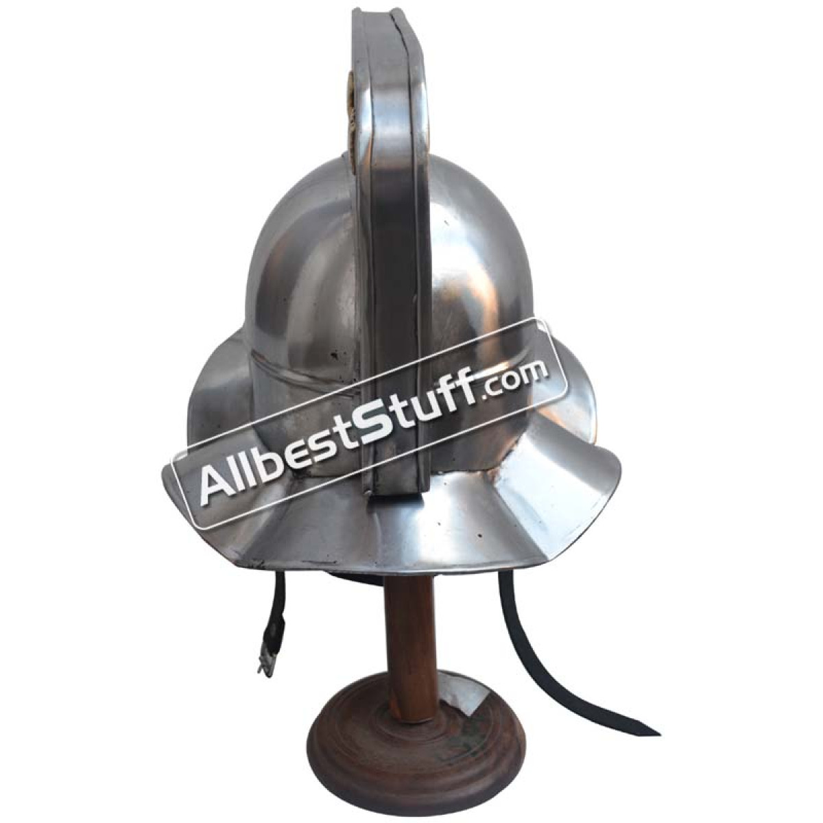 A true Roman helmet made from 14 Gauge steel capable of sustaining hard blows and protect the head during an SCA event. Full Face protection, The face plate is detachable and can be completely removed by removing locks & hooks, easy to handle. Use heavy inner padding for comfort wear.