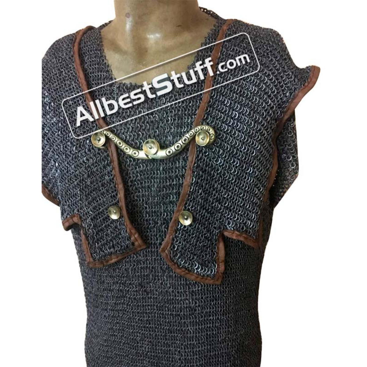 The Romans Maille hamata with shoulder doublet protection. Mail "Hamata" was generally worn by the Auxiliary troops, in the Empire Period; but legionaries also utilized it. Mail is particularly good as protection against slashing or blunt weapon attacks. This is a Mild Steel product that may requires fabric or arming gambeson underneath for maximum protection.