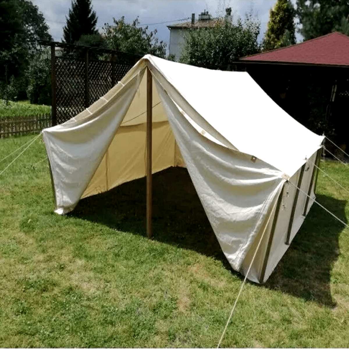 Medieval Roman Legion TentOur Roman Legion Tent is meticulously crafted to replicate the shelters used by the ancient Roman military. Designed with both authenticity and durability in mind, the Roman Legion Tent offers a practical and historically accurate solution for reenactments, festivals, and educational displays. Constructed from high-quality materials, each Roman Legion Tent is built to withstand the elements, making it ideal for outdoor events that demand reliability.Whether you’re recreating a Roman encampment or participating in a historical reenactment, the Roman Legion Tent provides the perfect shelter, capturing the essence of life as a Roman soldier. Explore our collection today and experience the timeless design of the Roman Legion Tent that brings history to life.Dimensions: 2 x 2 M tent Entrance height: approx. 2 mInterior height: approx. 2 mSide height: approx. 1 mNatural (cotton, 350 g/m2)