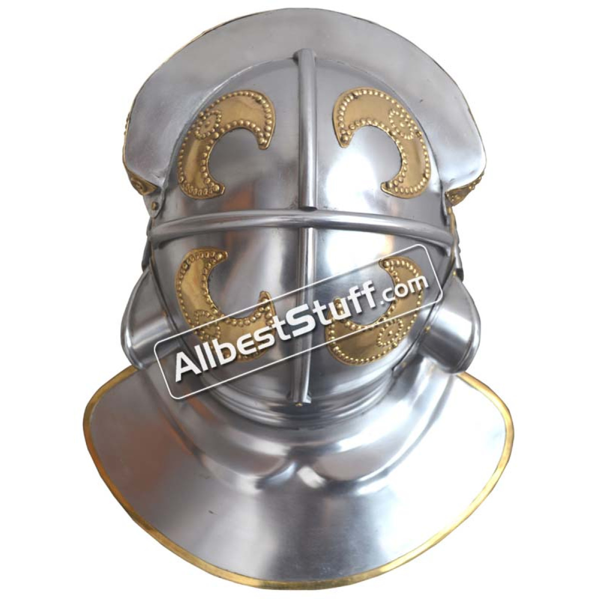 Made from 18 gauge steel with Brass TrimApprox. Circumference: 25 inchesThis Helmet comes with Leather Liner & Chin Strap