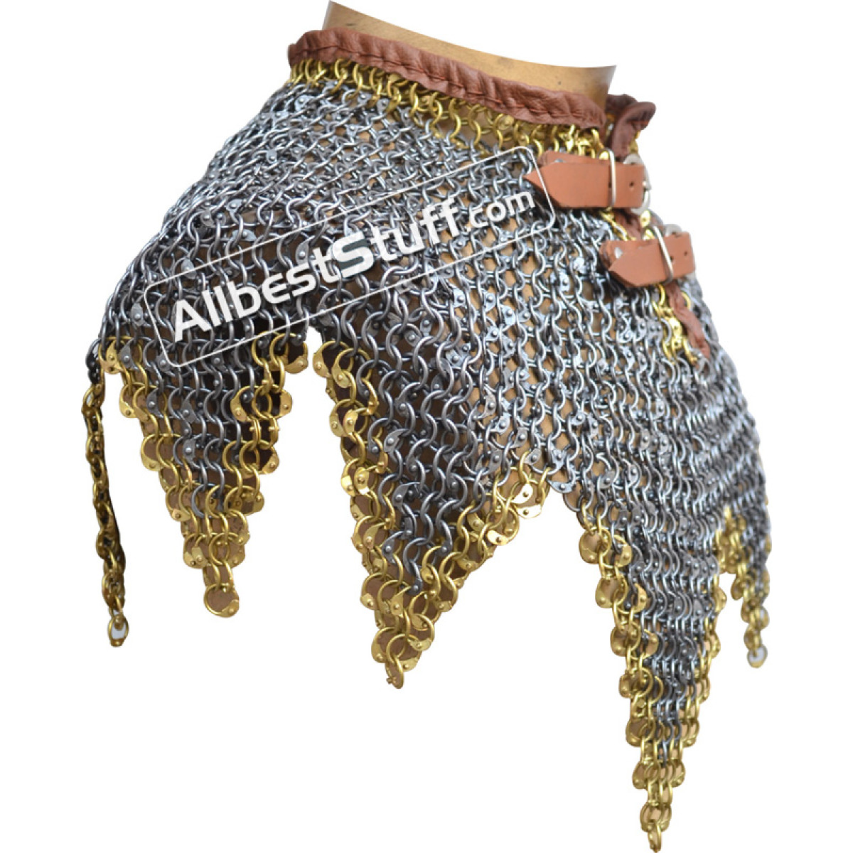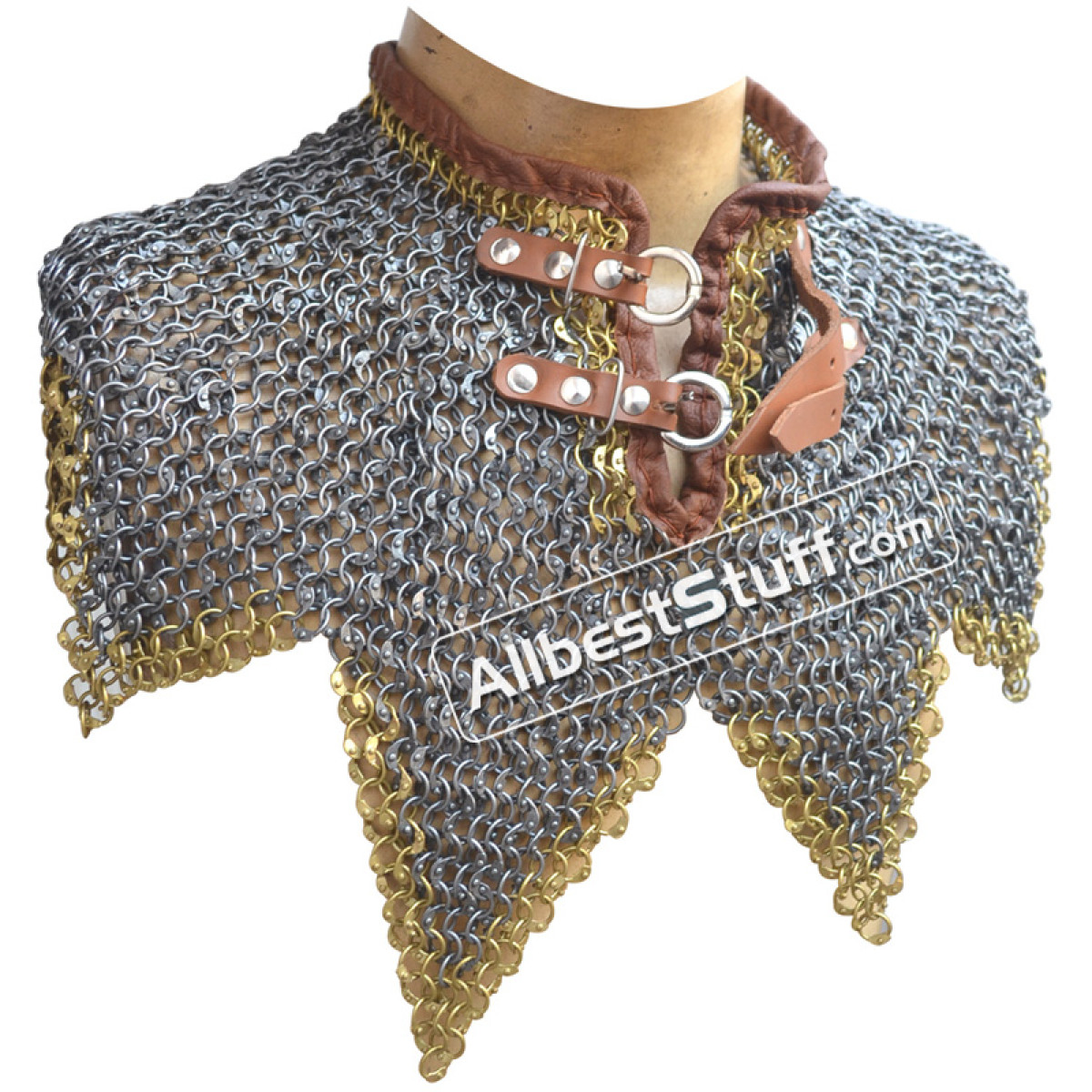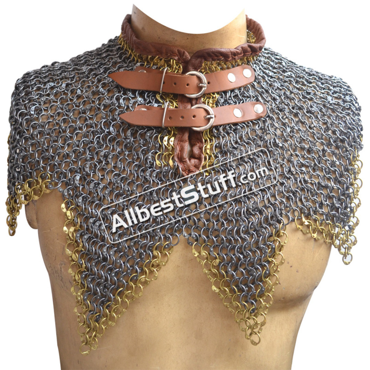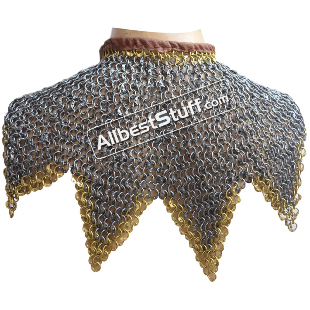 ABS offers hand riveted steel based maille collar, round dome riveted rings available in original oil, blackened or galvanized finish. 2 zinc buckle with leather fastener to cover the neck area. Zig Zag design at the bottom.