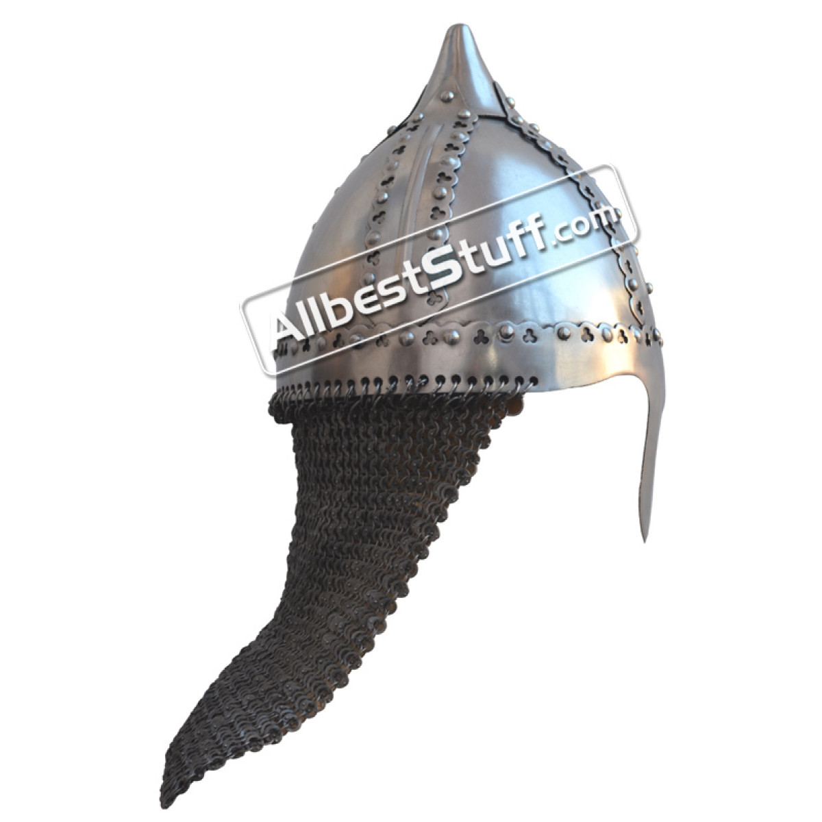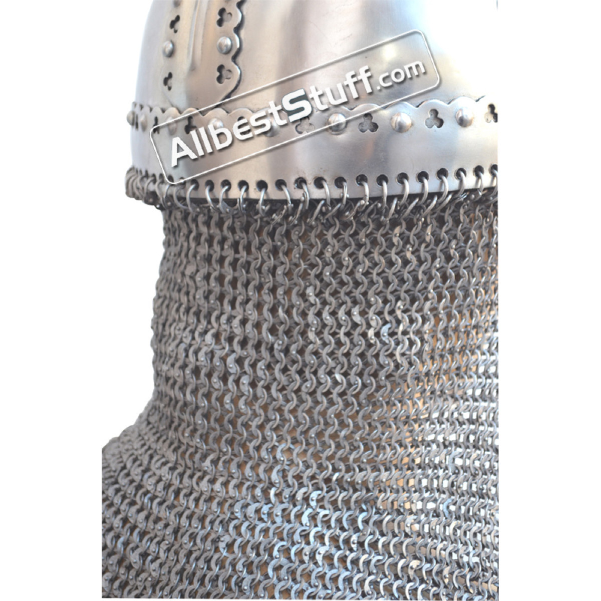 I ordered the helmet with a riveted aventail and I can report that the helm and maille looks beautiful together. This helm was exactly what ordered and arrived a few days early. Although the helm comes with a leather suspension liner and straps, it is best worn with a thickly padded coif as well. I intend to further modify the aventail by enlarging it and attaching it to the nasal guard. The aventail can also be nicely tied together below the chin. Great deal for a low price.