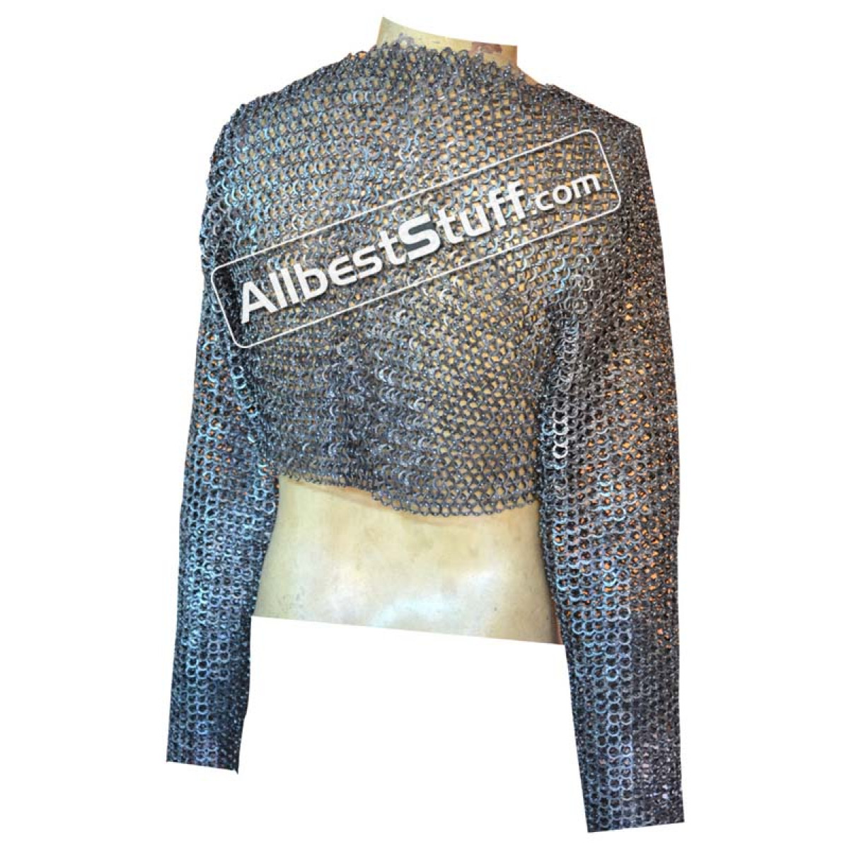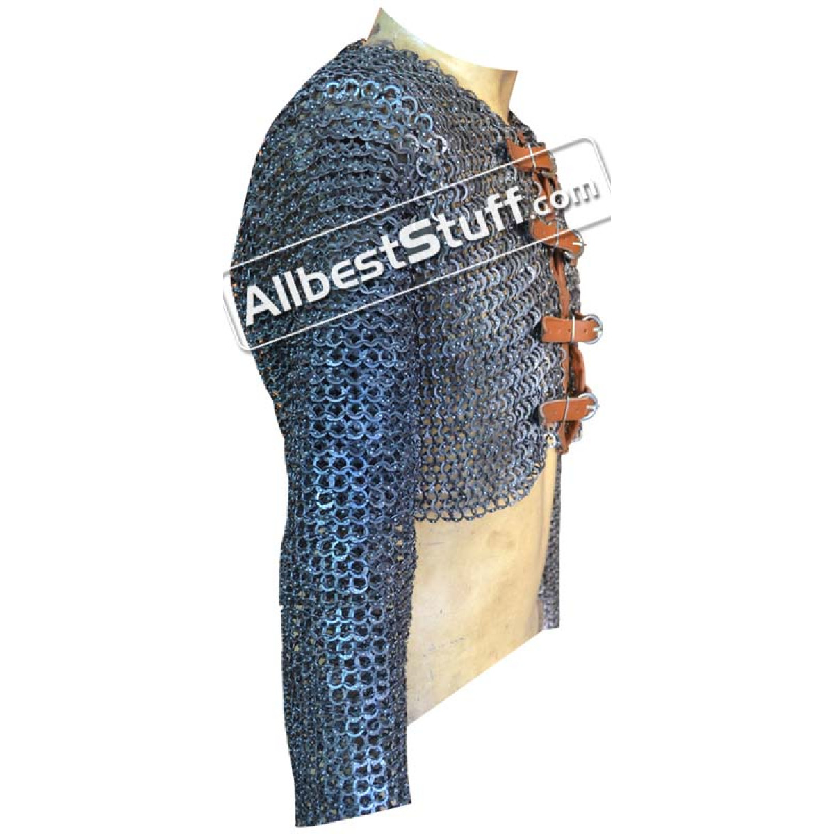 Rust Proof Stainless Steel version of Maille Half Shirt dome riveted, A slightly longer version closer to waist line approx as individual body shape vary, front fastener with leather piping & zinc buckle. Full long length sleeves with maille armpit gusset. Leather piping in front is included in the initial price, if you wish to have complete leather across top to bottom on edges, please select additional leather option at a little extra cost.