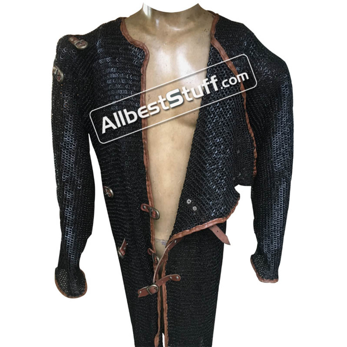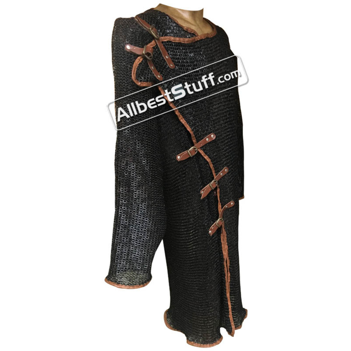 Exclusive outlook this 6 mm Round Riveted Flat Solid Maille is more attractive in person then in our amateur pictures. The left side of this maille overlaps on the right side and shoulder. The right portion that stays inside also has additional fasteners to get attached with inner garment / gambeson and does not hang offering appropriate balance to overall product. The left portion has leather fasteners to tie on opposite end and on right shoulder. The shirt has long length of 47 inches & is completely edged with leather for comfort wear.