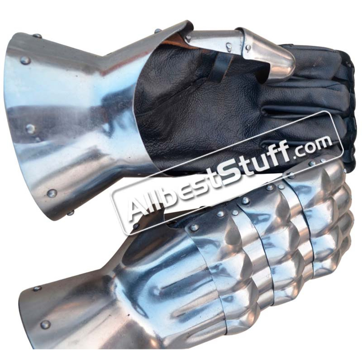 These fully functional are crafted from 16 gauge steel and are fully articulated. A black leather glove has been riveted and incorporated into the metal Gloves. The genuine leather glove helps to protect the hands in many ways and allows the sword wielder to have a solid and firm grip when fighting. Thumb and 4 fingers has been riveted down and is very flexible, allowing finger to fold freely. The leather glove is seamlessly stitched down to a thicker 5 mm leather and attached to the 16 gauge steel gauntlet using offering double strength. Thumb fully protected from hard blows with added protection to remaining fingers during fighting. Leather gloves riveted to leather sheet at edges for comfit wear. This item is covered in oil to prevent oxidation. Regular maintenance and cleaning should be done to prevent rusting.