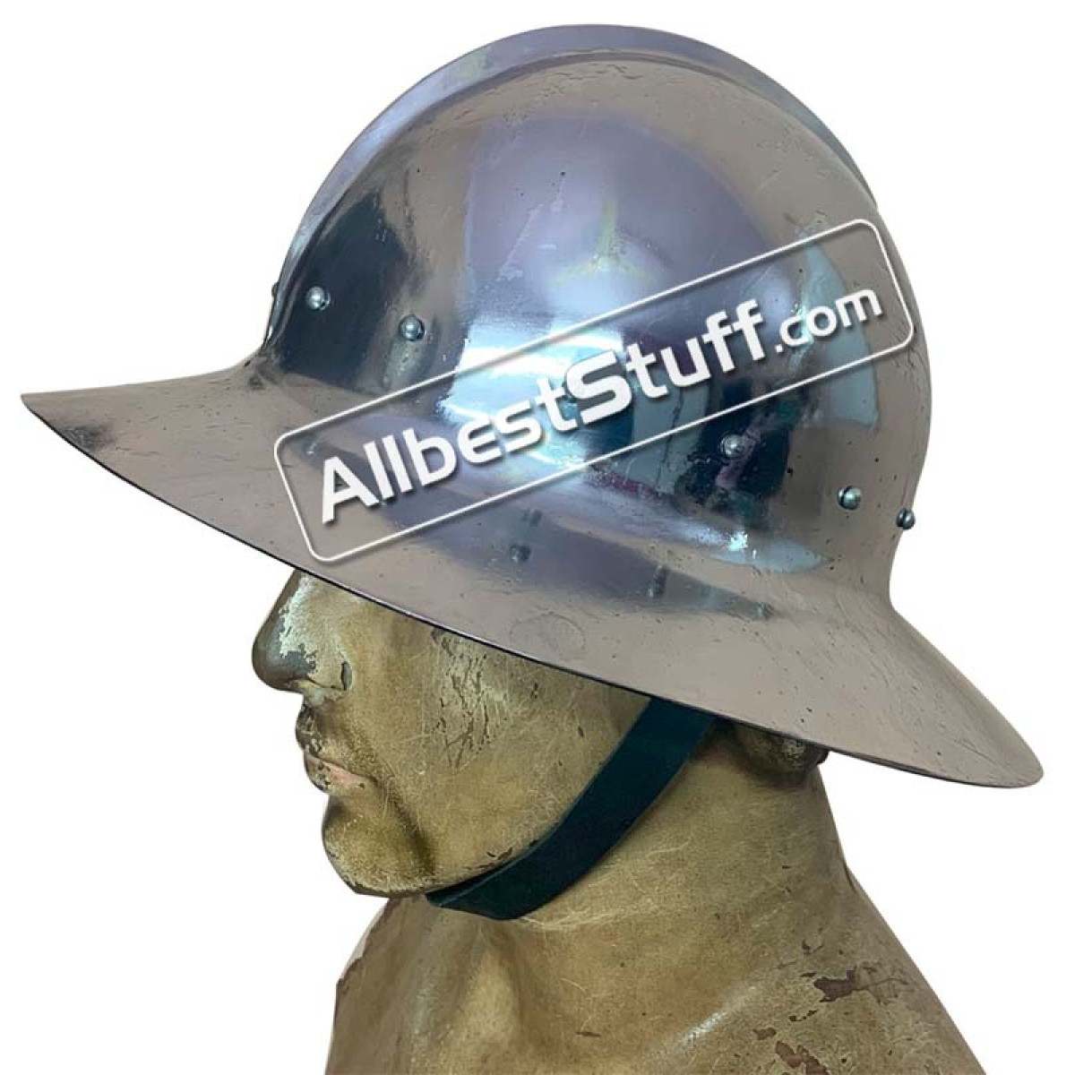 The kettle hat was a type of helmet that was used through whole Europe. It was mainly worn by infantrymen because the wide edge provided a good protection against blows from above (from cavalry) or projectiles that were thrown by the besieged. This battle-ready kettle hat is made after a type from approx. 1340. The Kettle Hat was probably developed from the Pot Helm, both aptly named because of their resemblance to cooking vessels. These helmets had many variations throughout the 13th and 14th centuries. Very popular among soldiers because it was relatively inexpensive and provided adequate head protection while still giving a wide range of vision.