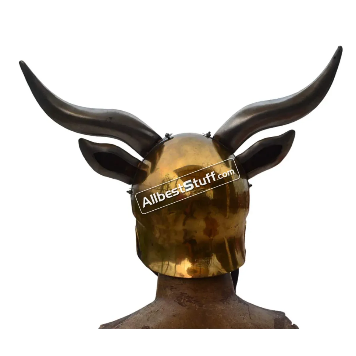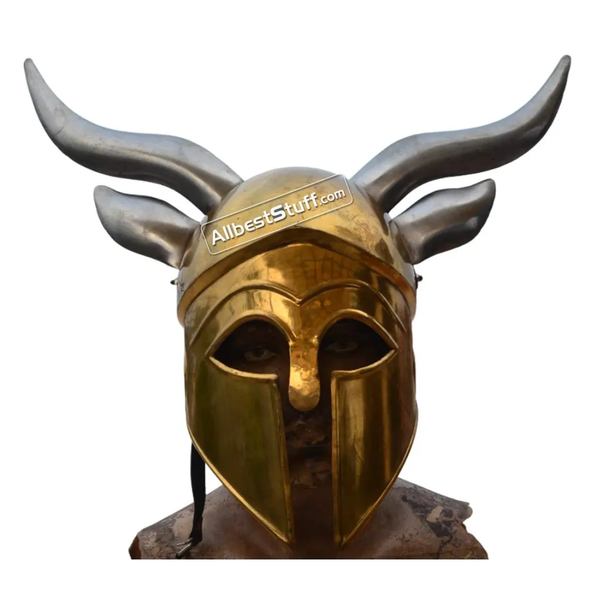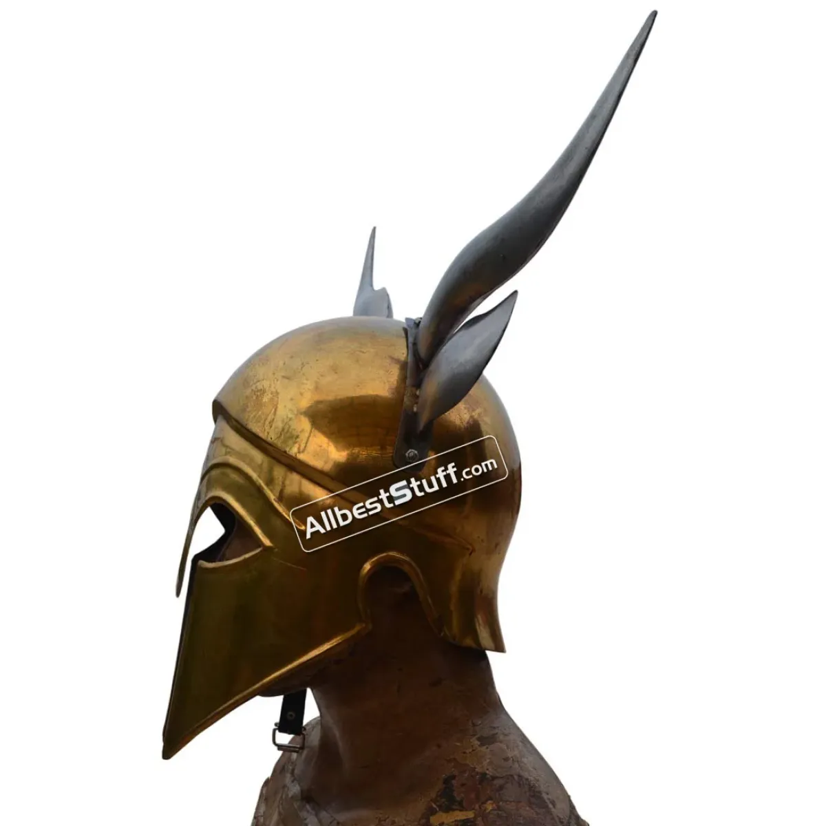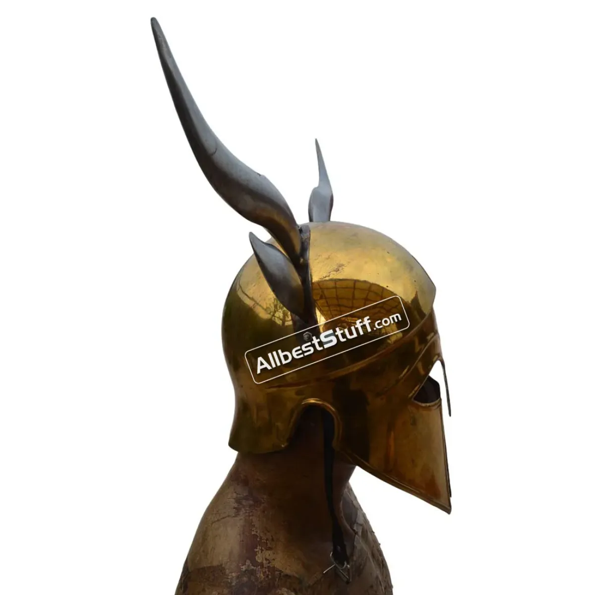Hand Made with Quality 18 Gauge Brass. This helmet has 2 steel horns also. The Greek helmets has increase likes of viking society specially after appearing in some of the popular movies. From the face of regular Corinthian helmet it has additional steel horn which makes it different from more famous and easy to carry Corinthians. This is a hand made product and actual product can have slight difference in finish.