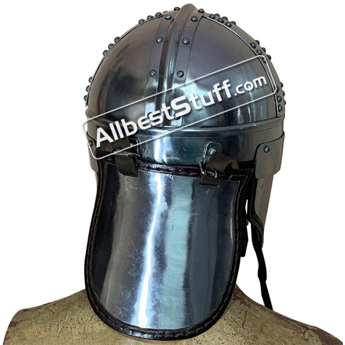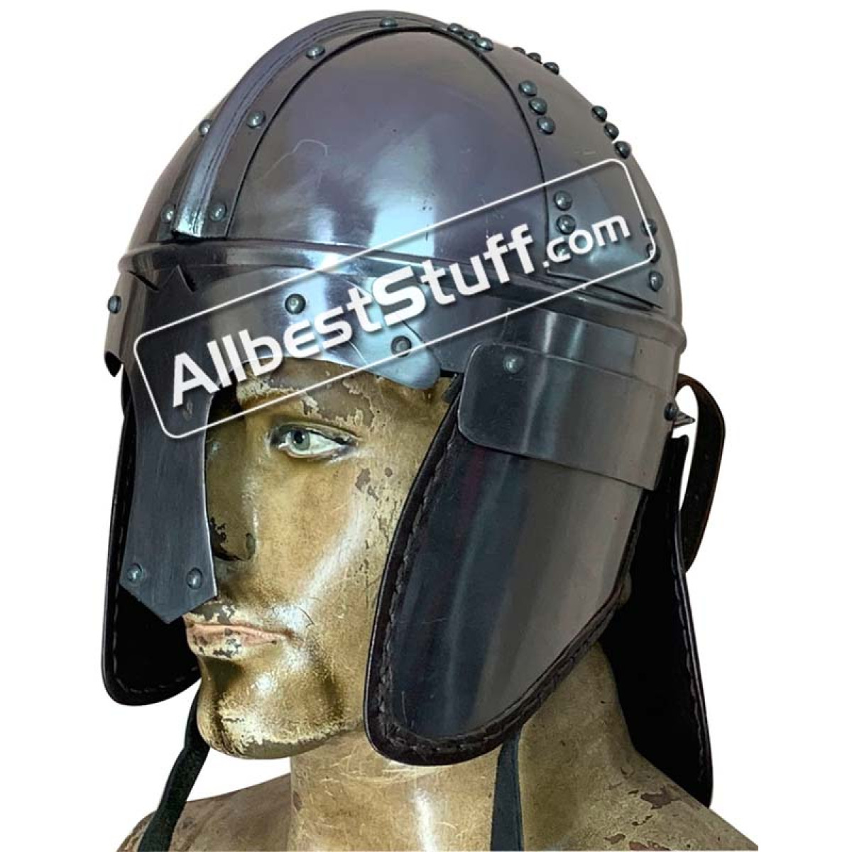 The Late Roman "Burgh Castle" Cavalry Helmet accurate replica ornate based off historical research and authentic in its design. This helmet incredible dates back to the 3rd century. this version is made from high-carbon steel and comes with leather interior. It also features a nose guard and rivets for extra support. This is a great addition to your collection, a companion to your high-end costume, and as a gift. Use a heavy inner padding inside for protection. Standard Adult Size fully wearable.
