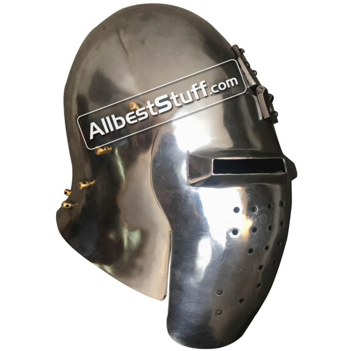Medieval Heavy 14 Gauge Steel Bascinet Helmet is characterized by the single central hinge of the removable visor and was common in 14th century Germany. The visor typically covered the parts of the face not protected by an aventail, attachment points (vervelles) for which are provided on this helmet. Made of 14 gauge. steel, this helmet offers full head protection and is lined and ready for use. Standard Adult Size fully wearable.