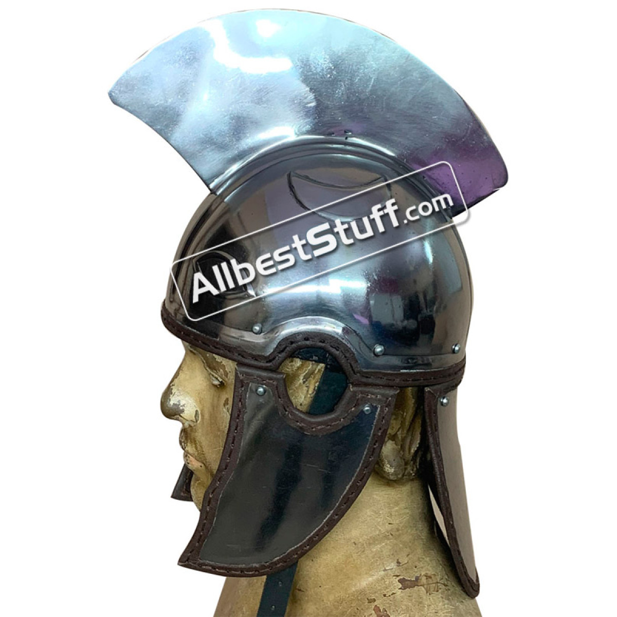 Late Roman Centurion Helmet is made from steel with leather interior. probably worn by auxiliaries instead of the legions. It seems to have been based on the similar "ridge" helmets of Rome's enemy, the Sassanian Persian empire. The eyes placed on the front of the helmet are reminiscent of the eyebrows on the fronts of the Imperial Gallic Helmets, and appear to be a Roman feature. This is a great addition to your collection, a companion to your high-end costume, and as a gift. Use a heavy inner padding inside for protection. Standard Adult Size fully wearable.