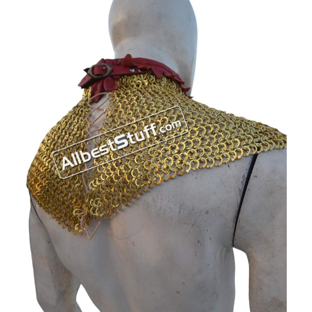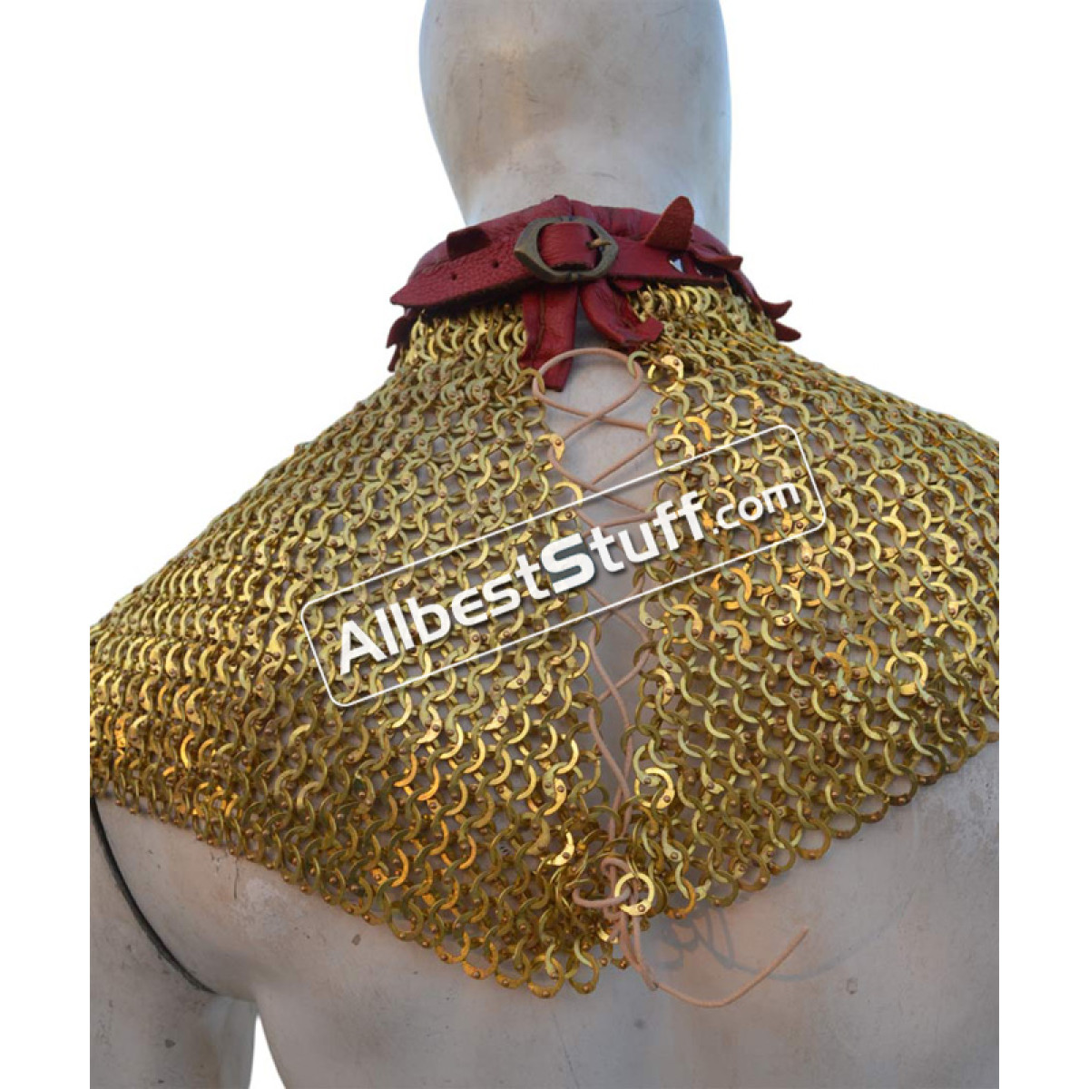 Medieval Stylish Chain Mail Collar with high neck. this piece still uses the same quality materials and finishing techniques to create a refined piece of armor. All of the mail rings on this standard are made from Solid Brass, We have used the standard mail ring pattern of 4:1 for the largest part of the collar, maille standards would have a tighter weave around the actual neck part, we’ve used a 6:1 weave on the neck, which looks excellent and provides a bit of extra protection due to the denser pattern of rings.