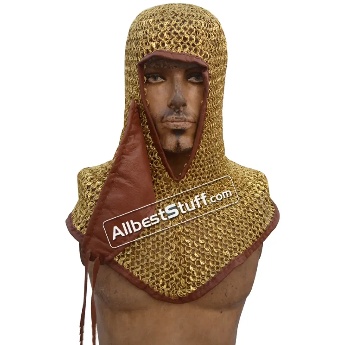 Key Features:Ring Size:16 Gauge 9 MM, All Rings are Round, All Rings are RivetedWeave Type: European 4 in 1 Round RivetedWire Type: Solid BrassItem Type: Chain Mail Hood with Side ventail CoifLeather Edging: OptionalBottom Helm Shape: Optional** Listing photograph is of original solid brass rings, add "Lacquer coating" from the "Finish" option to give your coif a more brighter shiny brass look