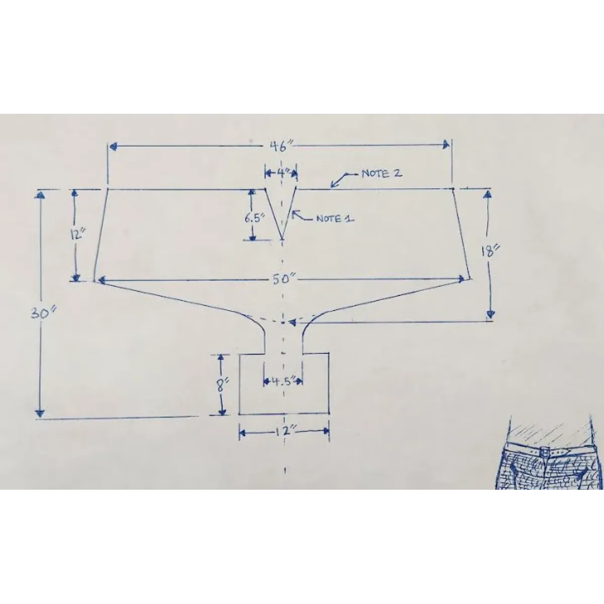 Upper Section:Left Side Height: 12 inchesRight Side Height: 12 inchesSlight Taper of 6 inches to join with bottom pieceCenter Split Width (Top): 4 inchesCenter Split Length: 6.5 inches