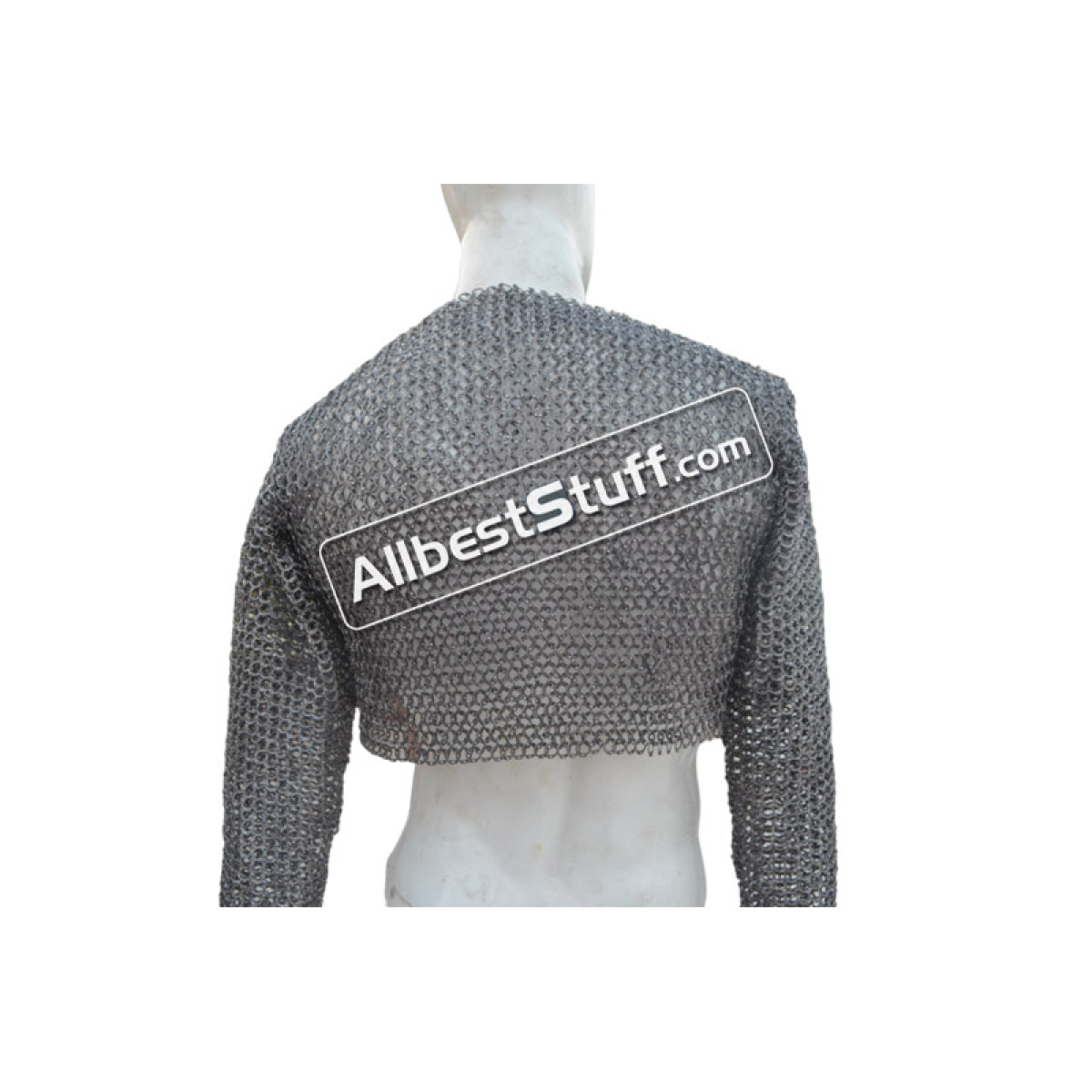 Rust Proof Stainless Steel version of Maille Half Shirt dome riveted, A short size chain mail with mid stomach length, front fastener with leather & zinc buckle. Full sleeves. Leather piping is included in the initial price, if you wish to have complete leather across top to bottom on edges, please select additional leather option as a little extra cost.