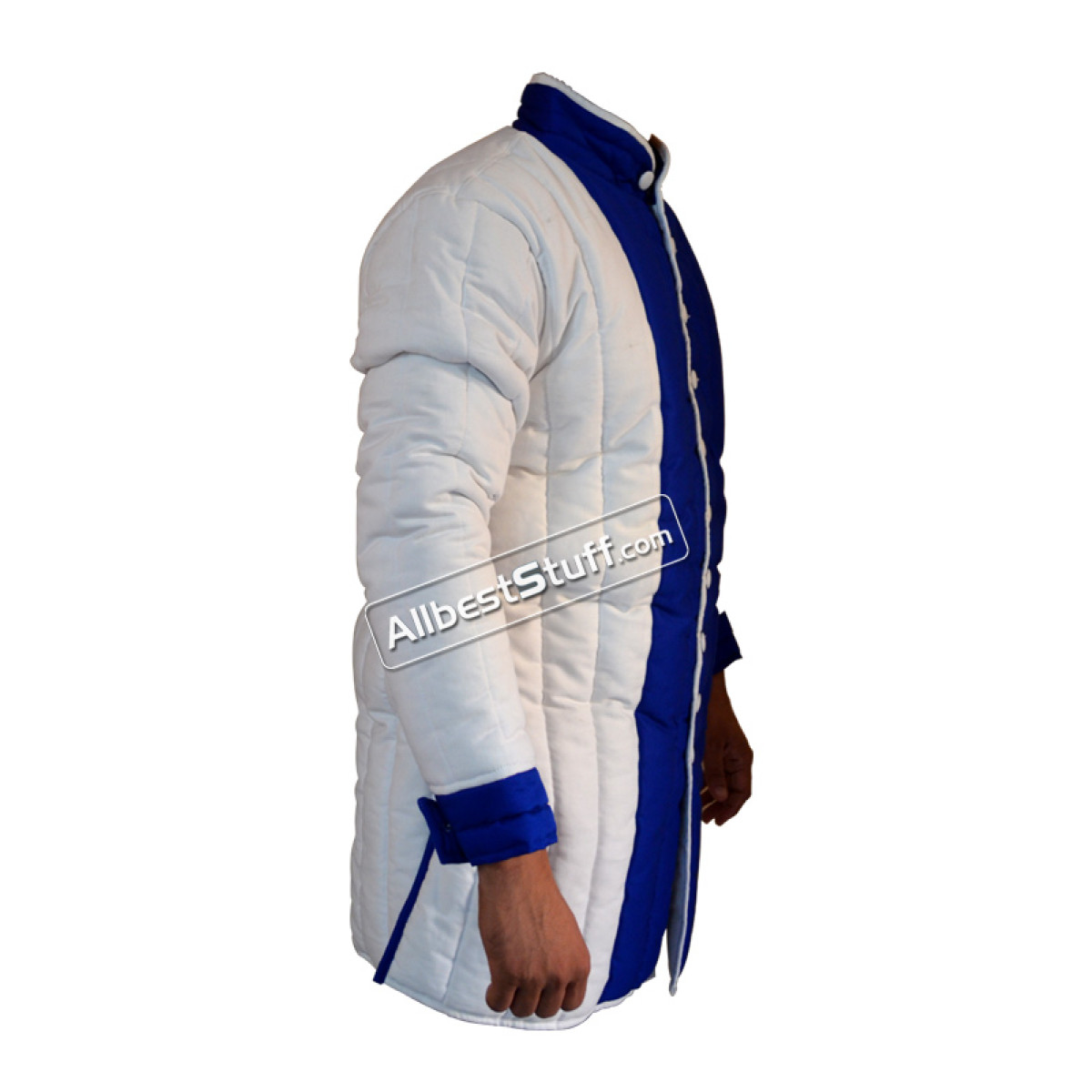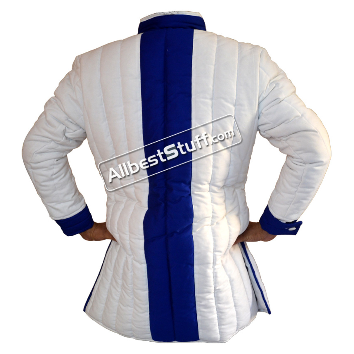 15th Century Padded Gambeson made from High Quality thick Cotton available under mix of 2 colors White & Blue representing medieval design. Full Sleeves offers full protection till wrist. Perfect for your chain mail armour, quality cotton with padding used in the making with front cotton easy to wear. Full Sleeves offering complete protection till wrist. Can be worn as a separate armor.