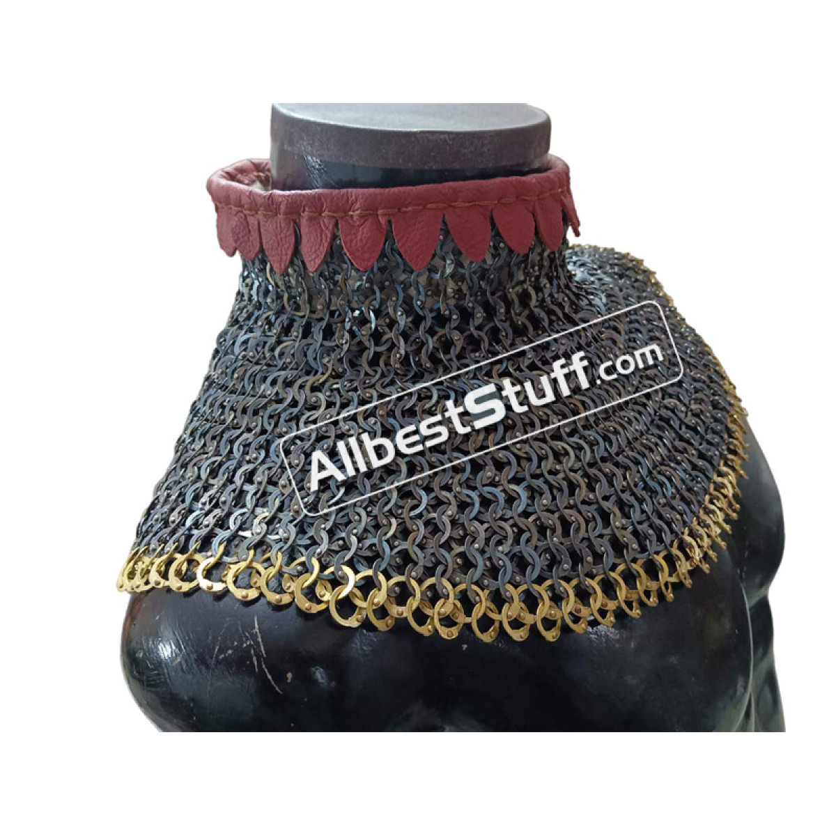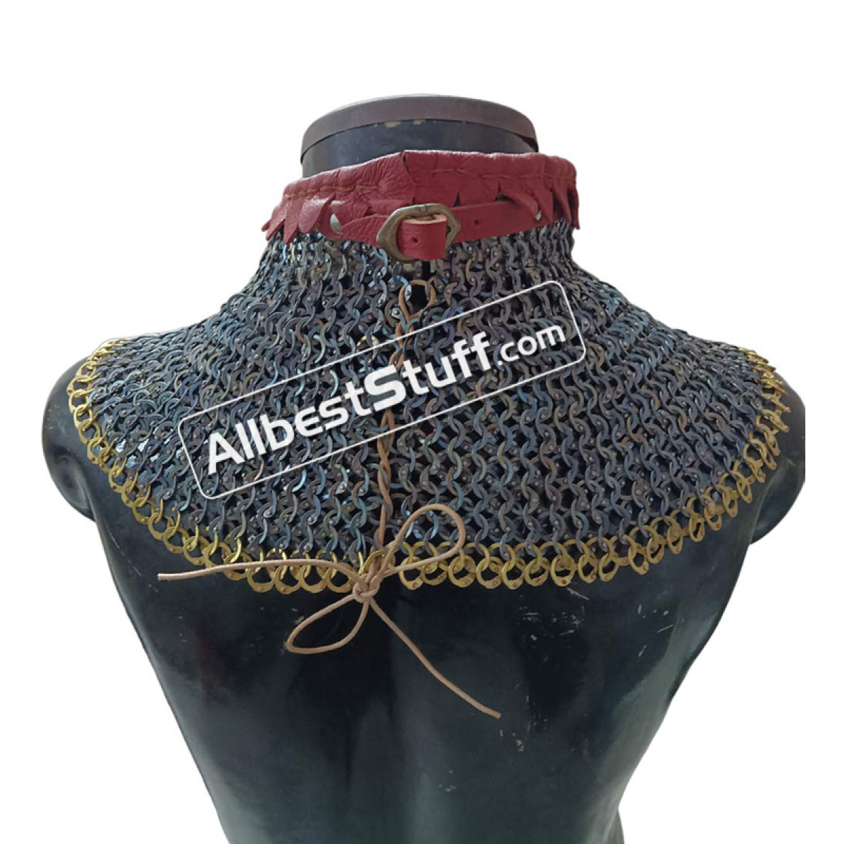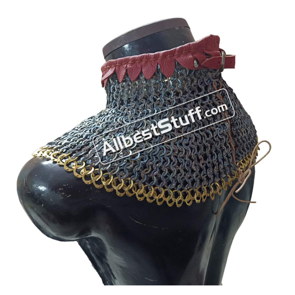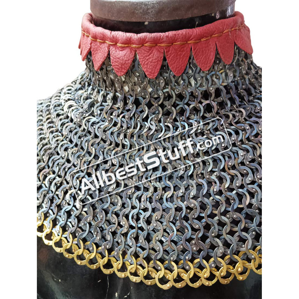 Titanium 9 MM maille collar with high neck collar. Linen padding for neck protection. Single Brass buckle with leather fastener to cover the neck area. Zig Zag OR Plain design at the bottom Optional.