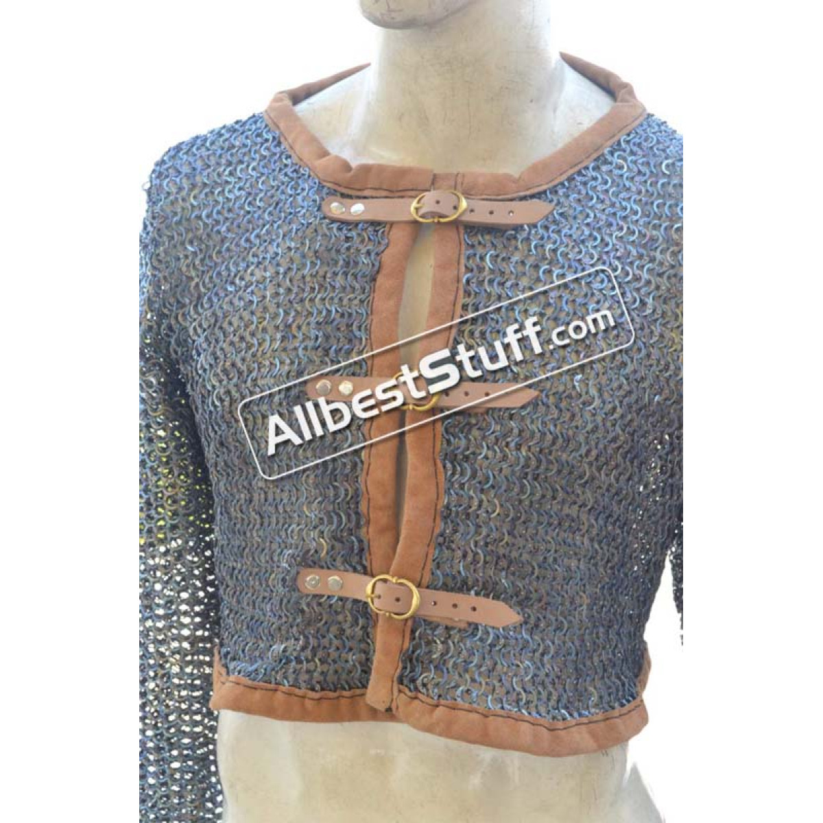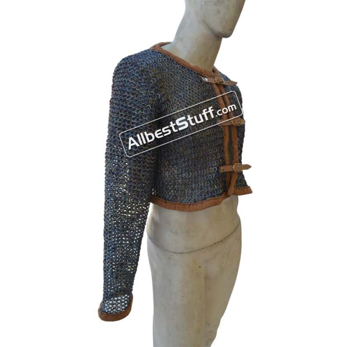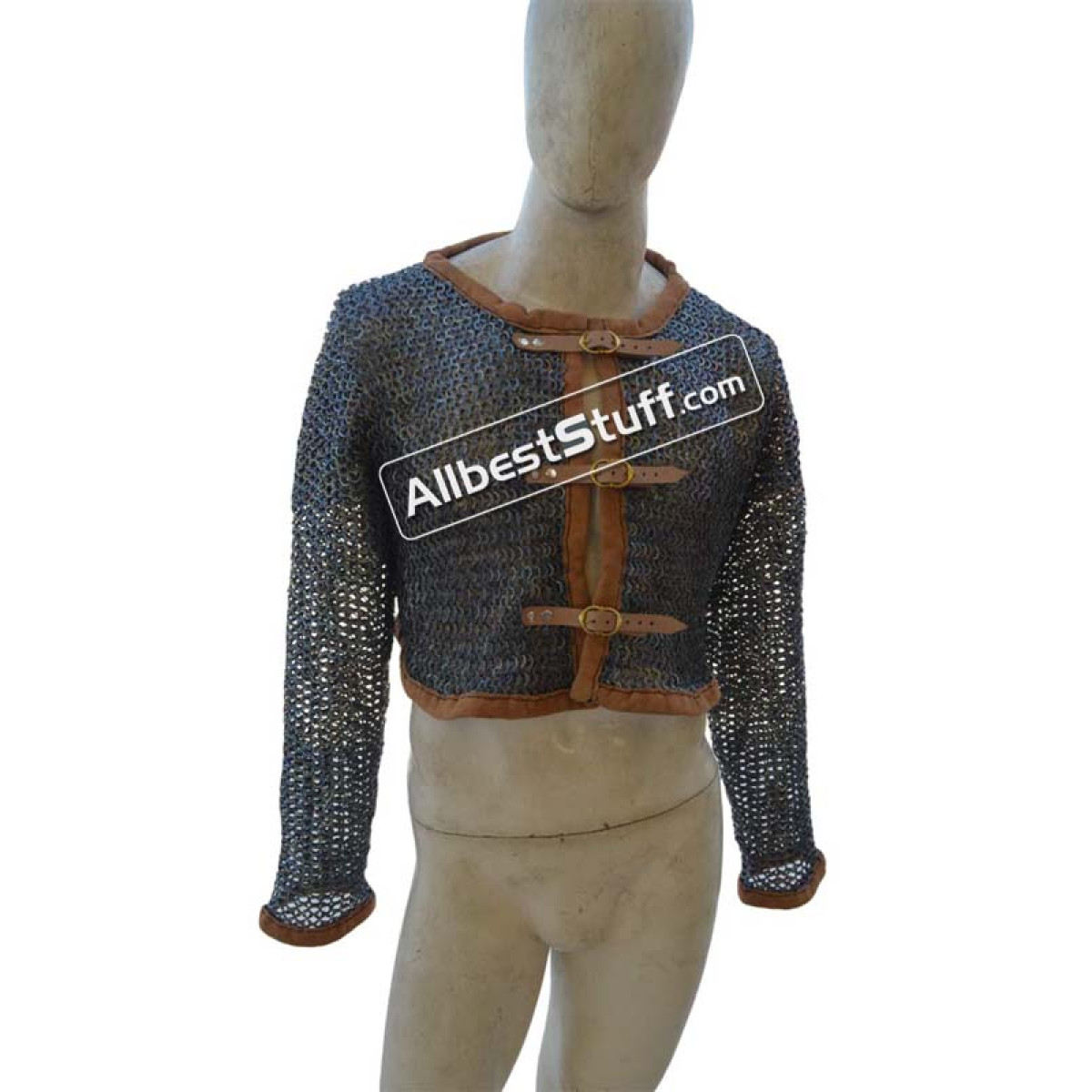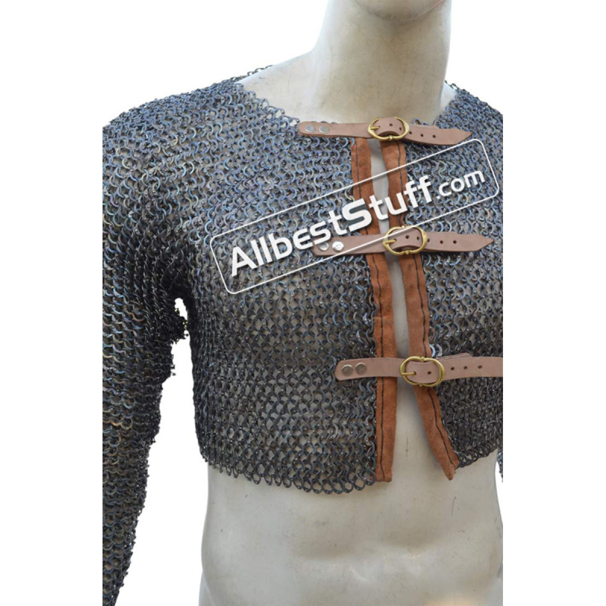 Flat dome riveted maille made from strongest material, A short size chain mail with mid stomach length, front fastener with leather & zinc buckle. Full sleeves. Leather piping is included in the initial price, if you wish to have complete leather across top to bottom on edges, please select additional leather option as a little extra cost.