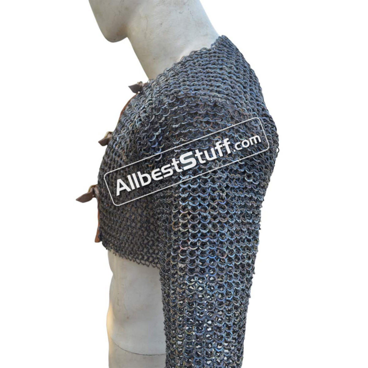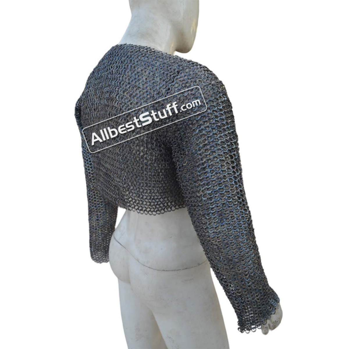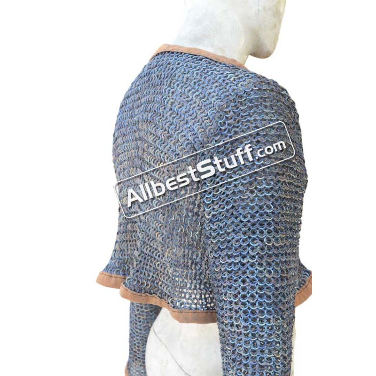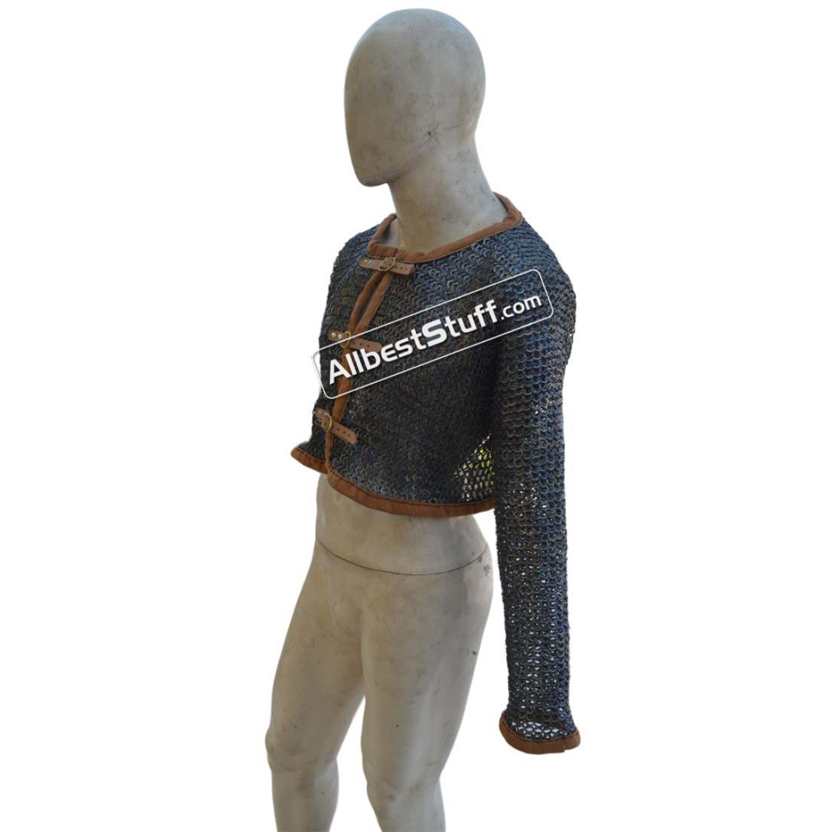Flat dome riveted maille made from strongest material, A short size chain mail with mid stomach length, front fastener with leather & zinc buckle. Full sleeves. Leather piping is included in the initial price, if you wish to have complete leather across top to bottom on edges, please select additional leather option as a little extra cost.