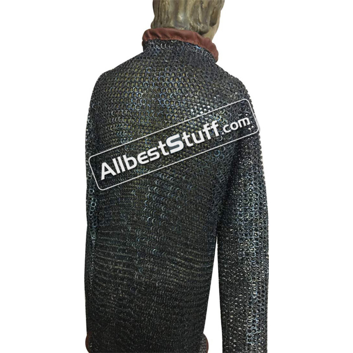 Flat dome riveted maille made from strongest material, front fastener with leather & buckle. Full sleeves. if you wish to have complete leather edges, please select additional leather option as a little extra cost.
