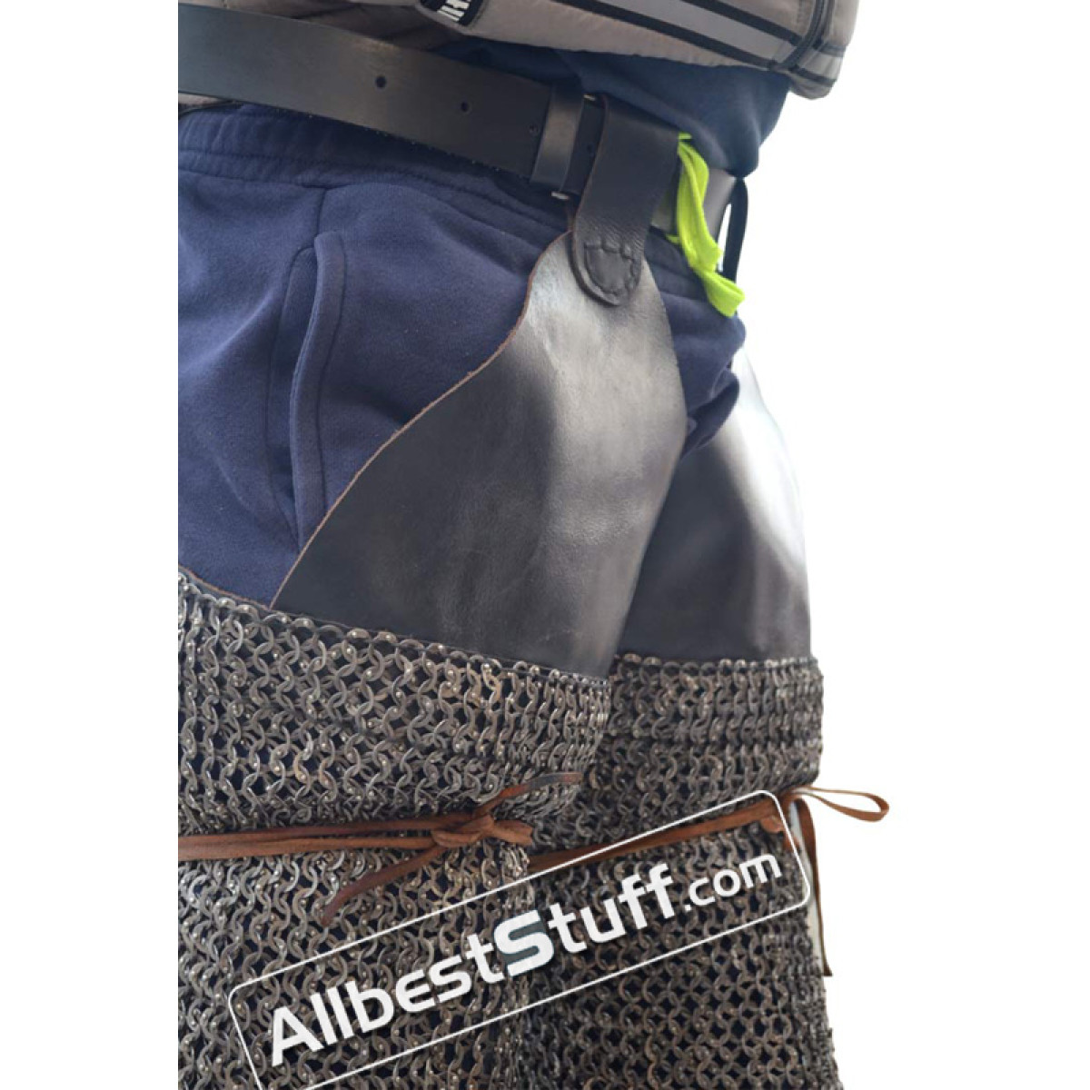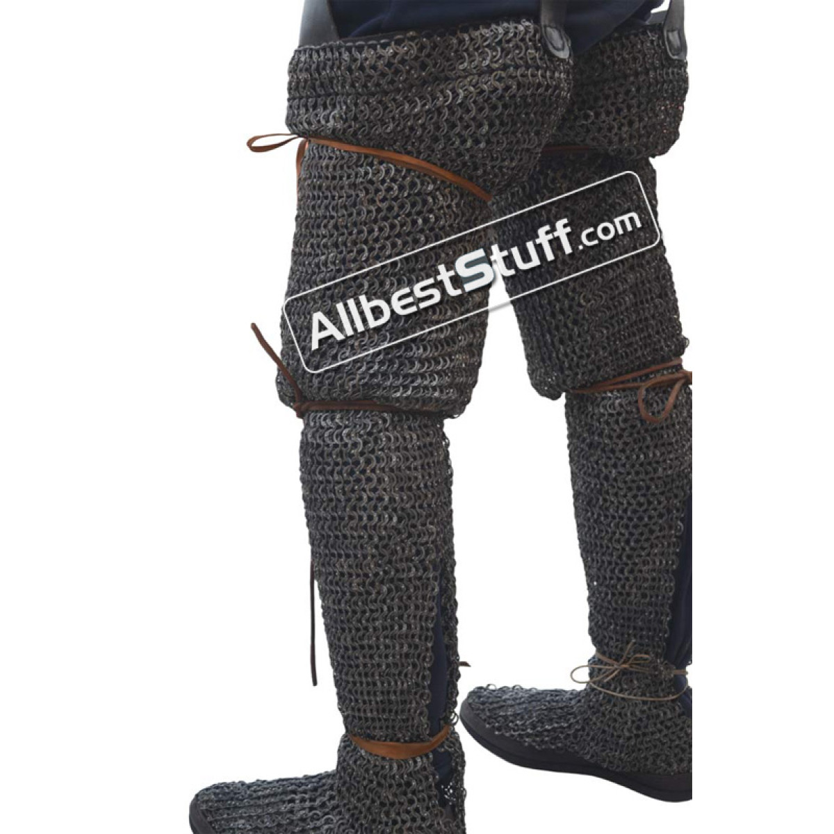 Features:Incorporates leather support at the front and back of the thigh, providing additional protection.Includes a loop that can be easily inserted into a waist belt, ensuring a secure fit while you move.The construction of the chainmail leggings prevents unnecessary strain on your legs, enabling better agility and mobility.