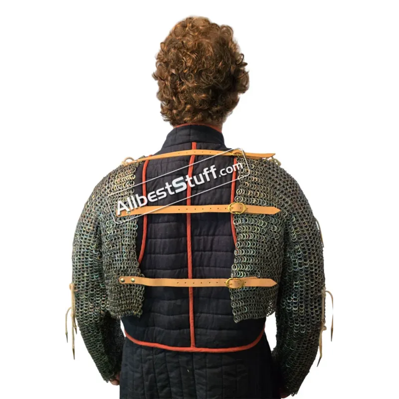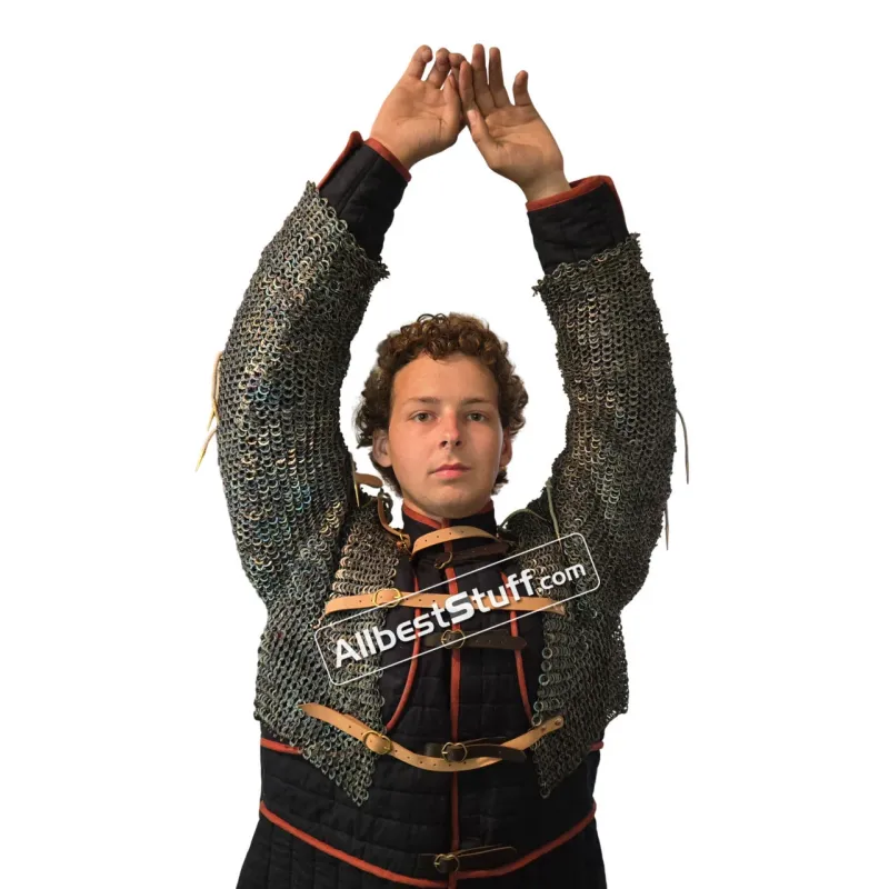 Material: Made from Titanium WireRing Type: 18 Gauge 9 MM Full Flat Dome RivetedChest Size: 35-40 inches, the 2 pieces will give approx 8-9 inches of chest and back coverage on each side03 Nos Leather fasteners to close the frontSleeve Style: Fully ClosedLength of Sleeve: 20 inches measured from under the armpit area to wristSleeve Circumference at Armpit: 20 inches (Default) choose preferred circumference from additional optionsOverall Length from Shoulder: 16 inchesFinish: Original Titanium