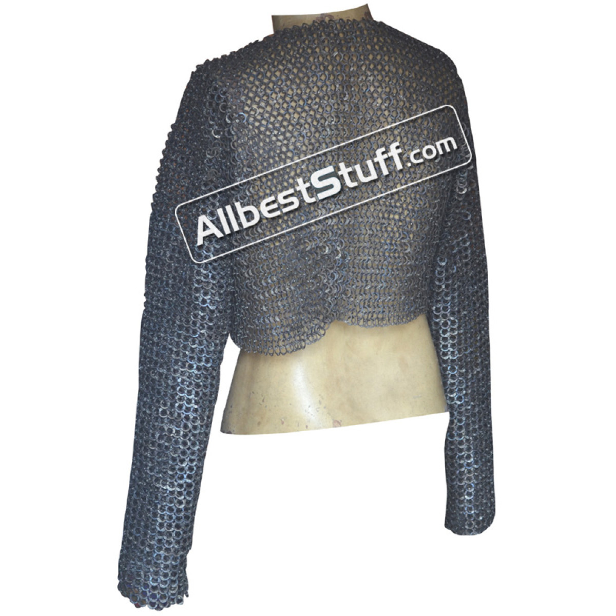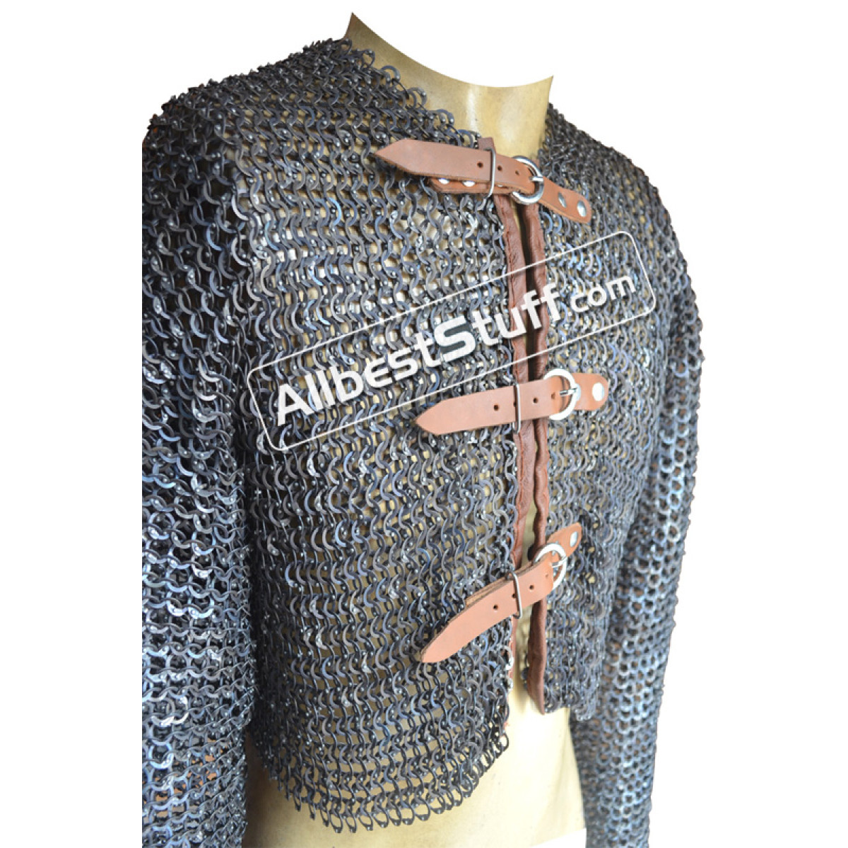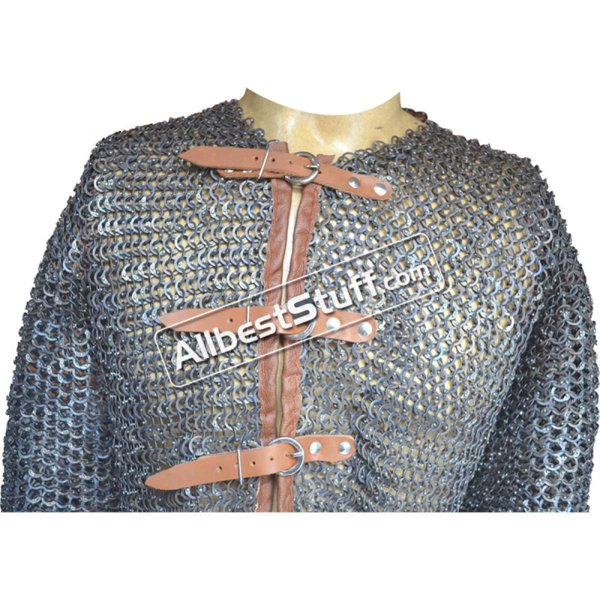Flat dome riveted maille made from strongest material, A short size chain mail with mid stomach length, front fastener with leather & zinc buckle. Full sleeves. Leather piping is included in the initial price, if you wish to have complete leather across top to bottom on edges, please select additional leather option as a little extra cost. Comfortable fit for actual chest size 40 inches.
