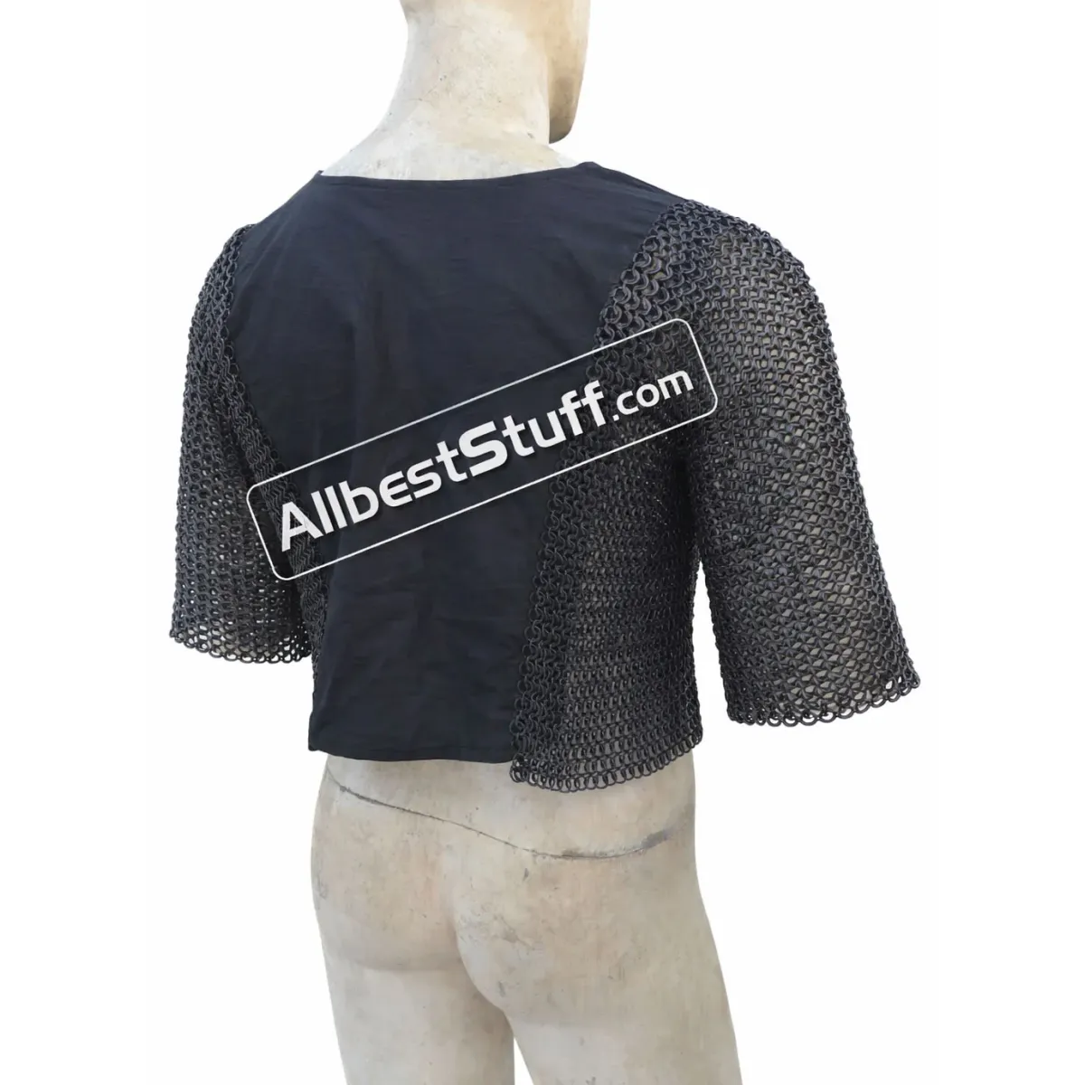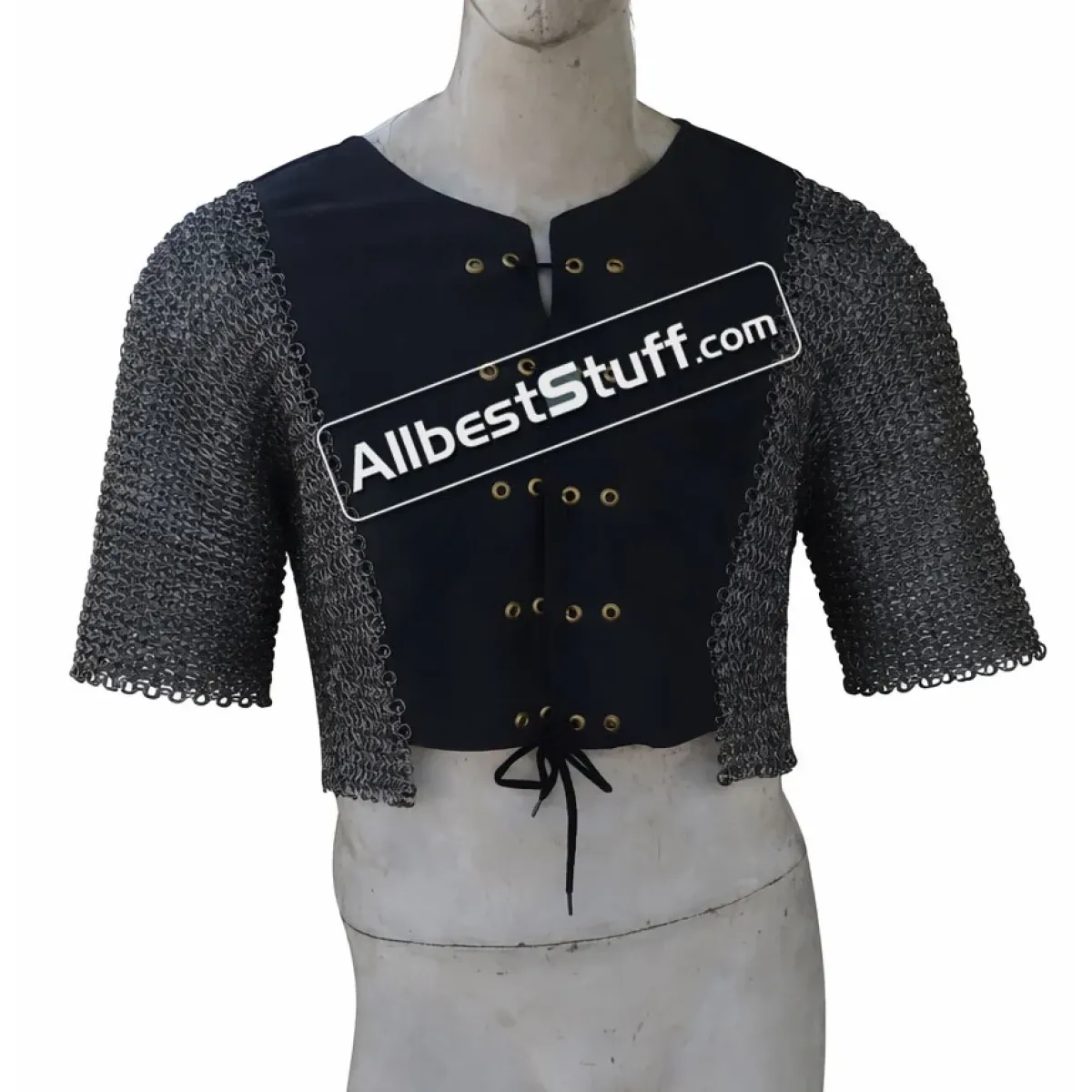 6 mm flat ring chainmail sleeve attached to the sleeveless garment vest, fully closed chainmail sleeve with protection to both sides of torso. Made with mild steel (Iron) 6 mm flat Wedge riveted ring with alternating solid ring.